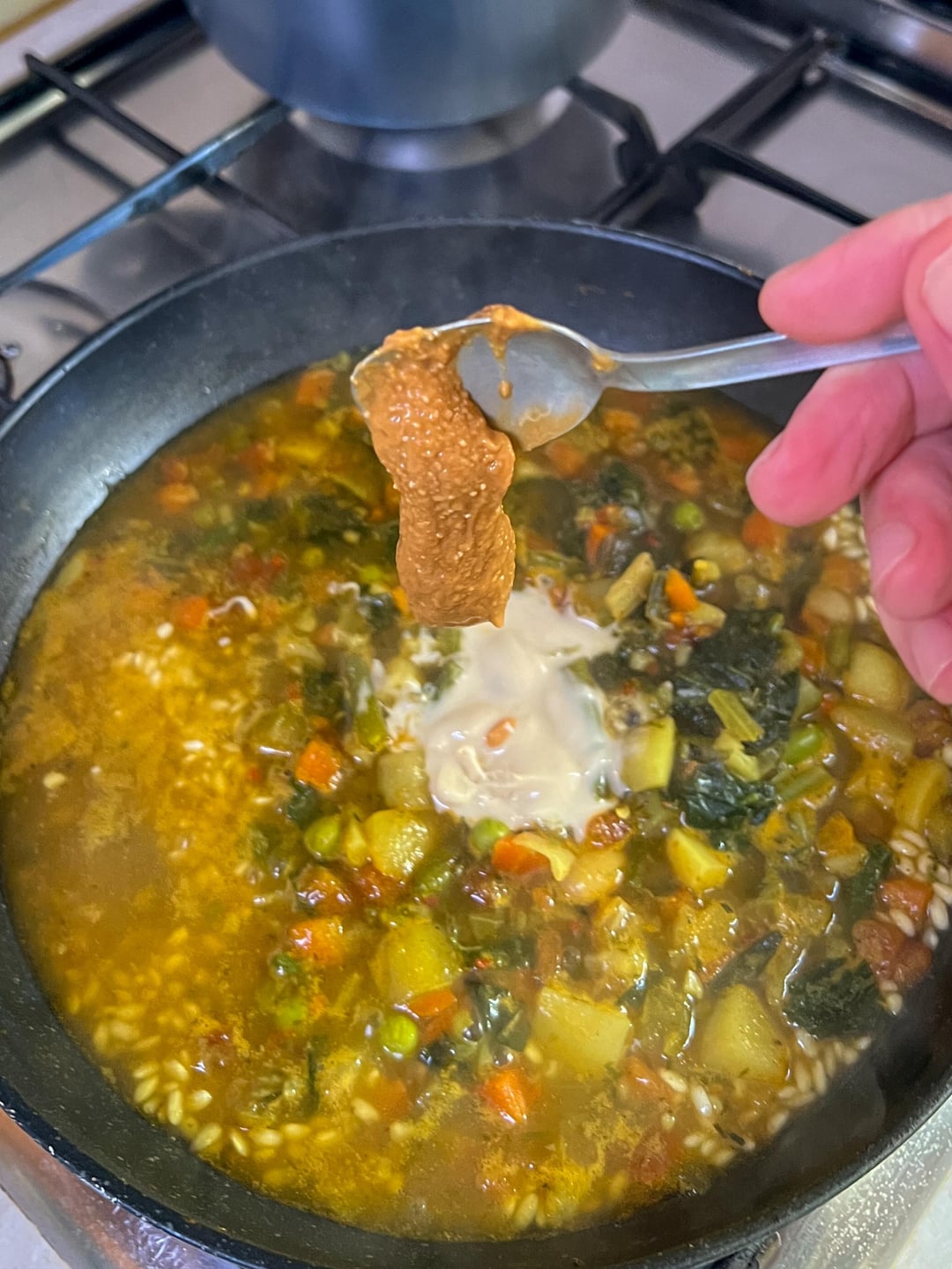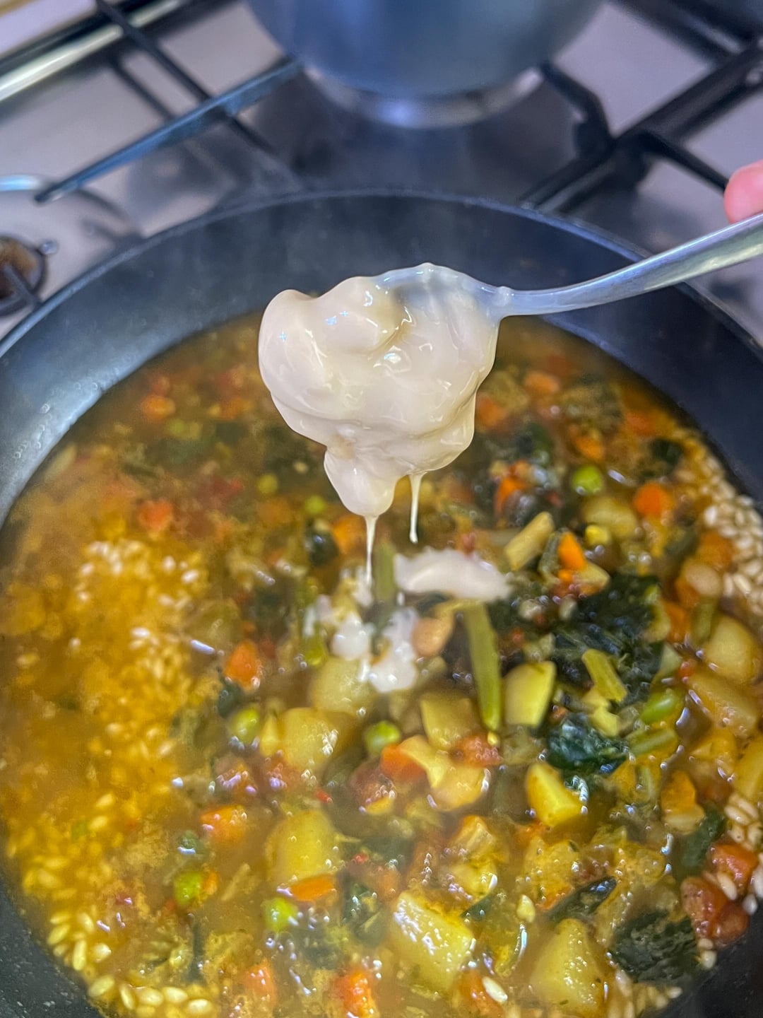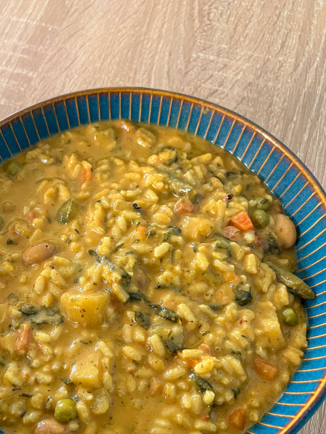 - 150-200g mixed frozen vegetables (I used peas, pinto beans, spinach, tomato, chard, potato, carrot, celery, onions, cabbage, green beans, zucchini, basil and a bit of frozen vegetable stock)