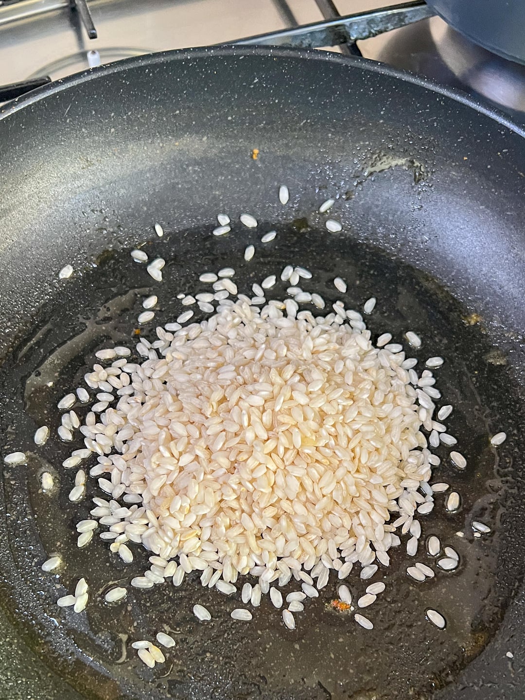 - In a non-stick pan on low heat, put some oil, let it get warm and drop your rice in. Let the rice toast for 3-4 minutes (always at low heat), stirring from time to time, until it develops a slight golden color.