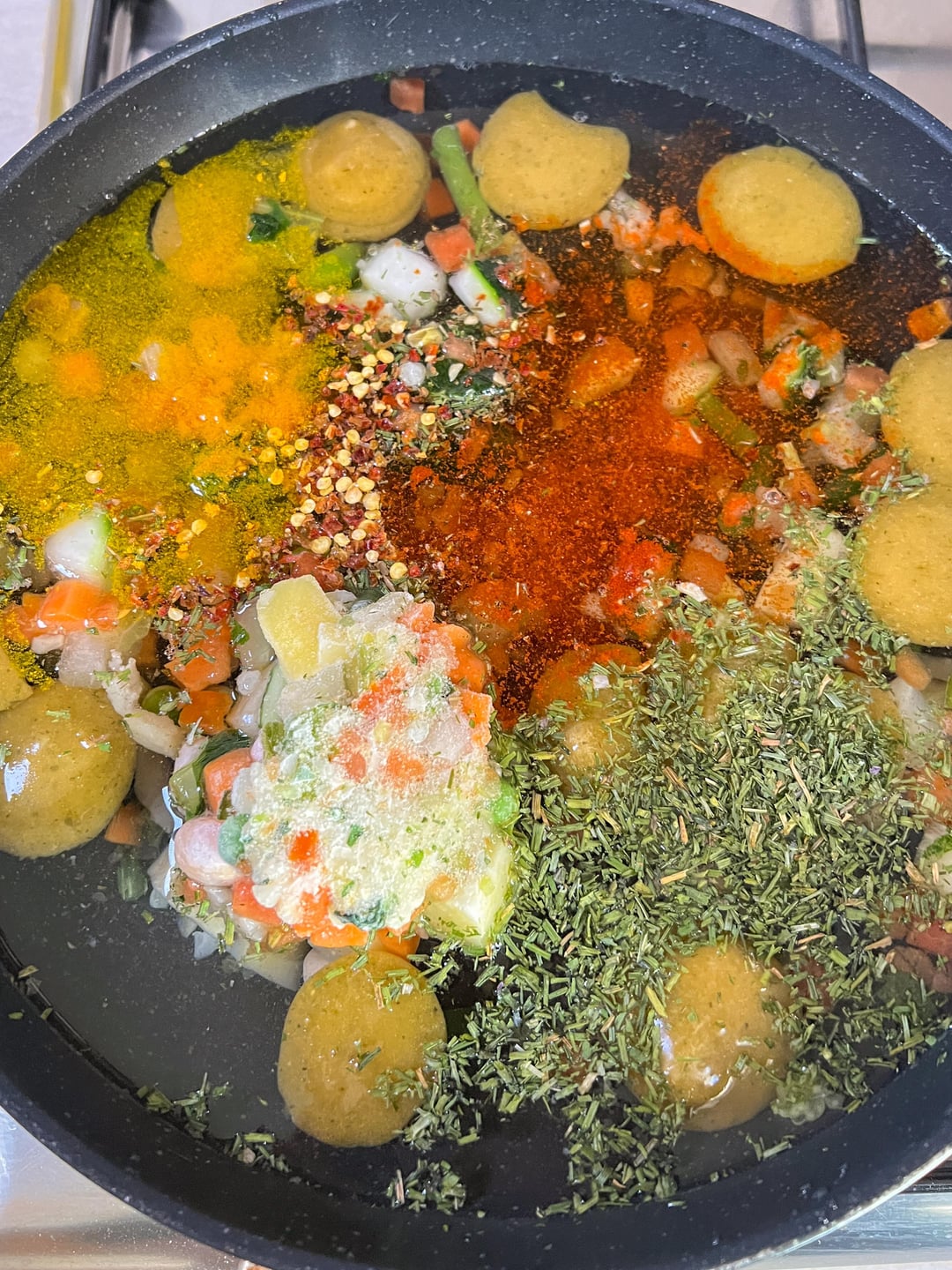 - a mix of herbs and spices (I used dried chives, dried thyme, turmeric, chili powder, garlic powder, paprika powder and chili flakes); add to your liking