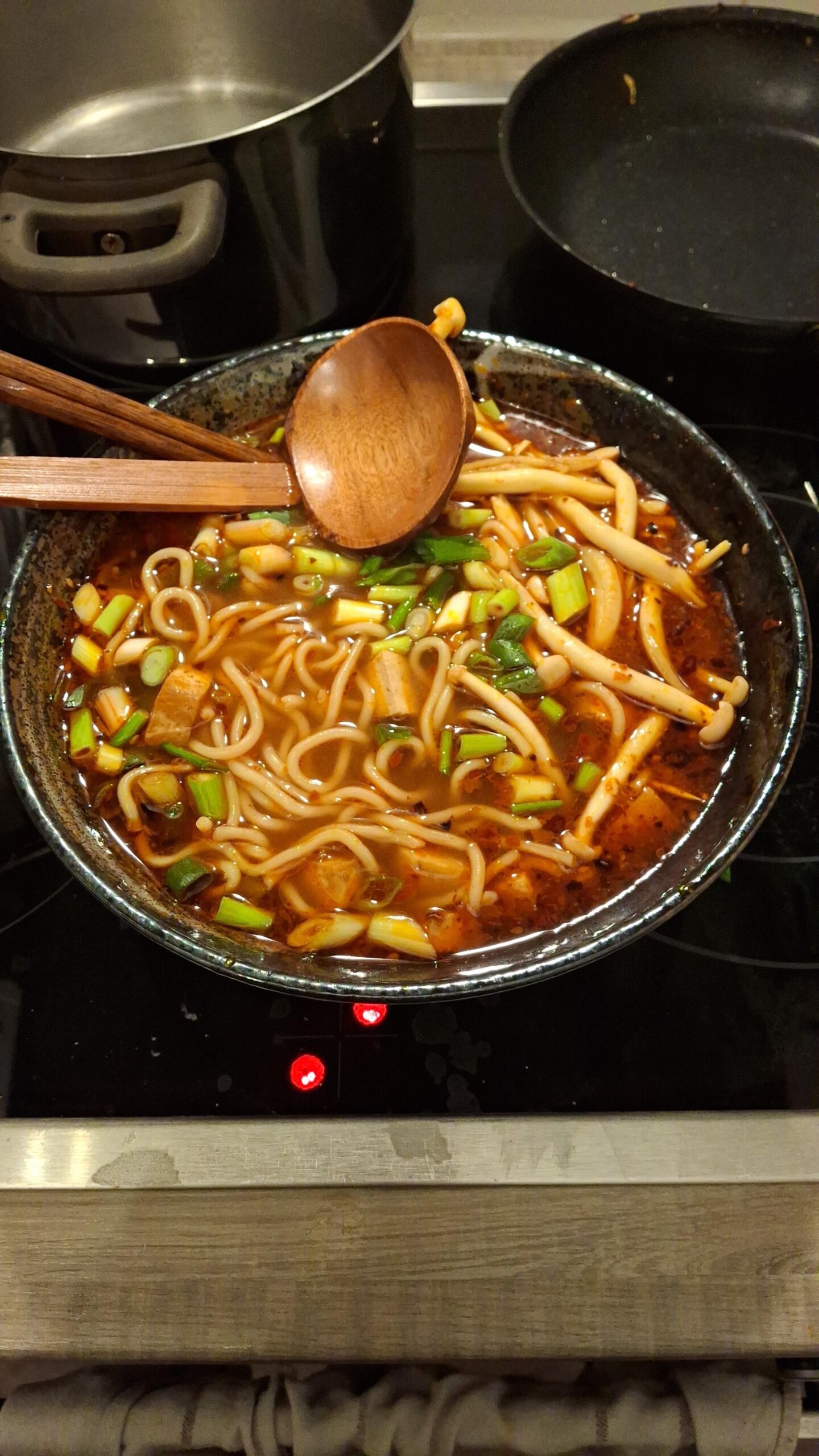 First time homemade ramen. I used store bought shoyu broth and dark miso paste, tofu fried in chili oil, enoki mushrooms, corn and spring oinion.by XmatschkopfX Dining and Cooking