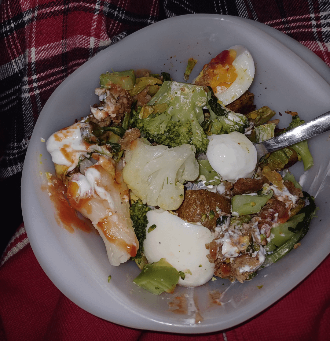 Oh, I do the same (without the eggs and ketchup tho) Lmao.