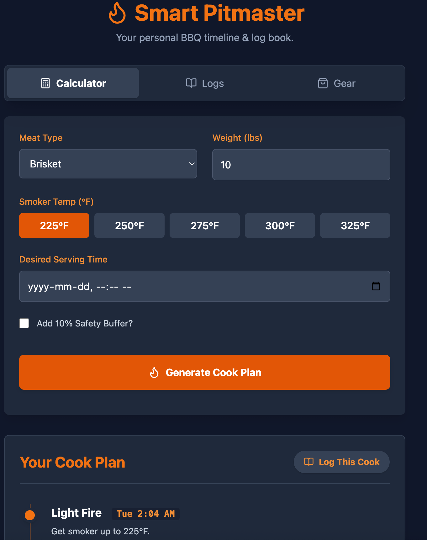 It works backward and generates a full schedule (When to light the fire, when to wrap, when to pull, and when to rest).