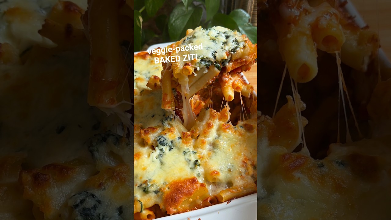 Sometimes you just need to make a dinner that sneaks in a ton of veggies but tastes like pure comfort food. And when that time comes, we make baked ziti. This is kind of like a more laid-back lasagna. You just kind of dump everything into the casserole dish in layers. We’ve got that veggie pasta sauce, a ricotta and spinach mixture, and then your pasta. All of that can be done a few days in advance and just stored in the fridge until you’re ready to eat. And then just bake until golden and gooey. Happy eating.