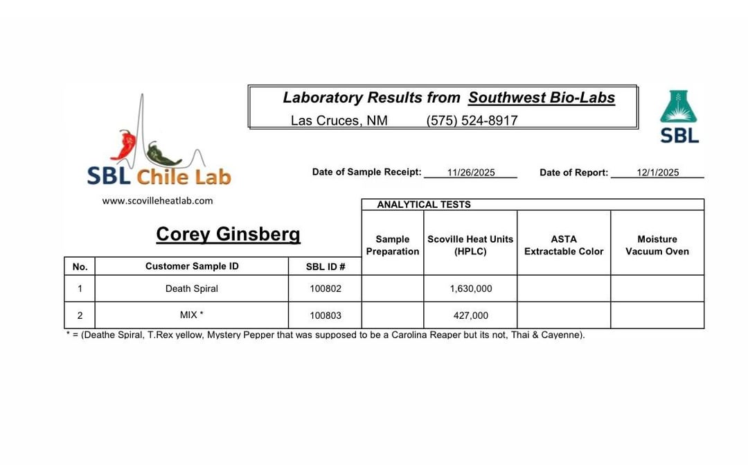 Sent my Death Spiral powder and a mix of all my peppers in for testing. The results were surprising. 1,630,000 for the Death Spiral and 427,000. I knew the stuff was hot. That’s why I sent it in. Didn’t think it was this hot!!