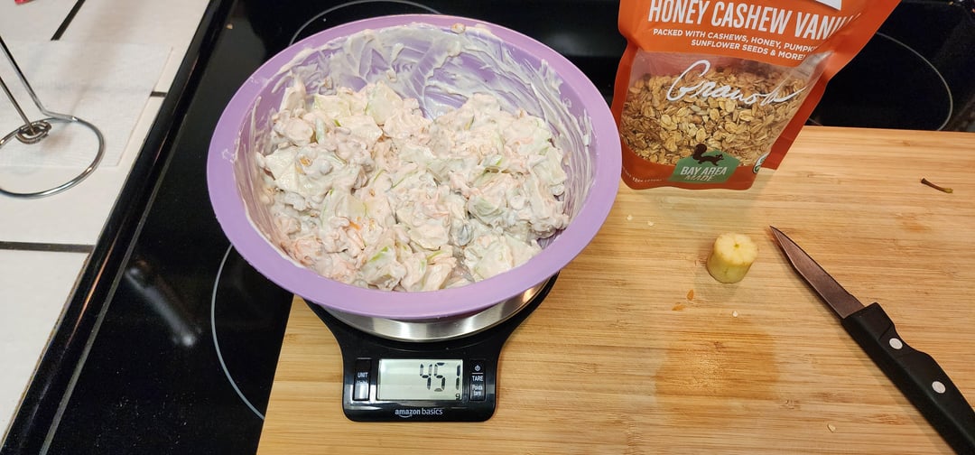 200g Greek yogurt + 11g habanero + .5g cinnamon + .5g cocoa powder + 161g granny Smith apple + 48g granola = 333 calories | 41g carbs | 5g fat | 26g protein | 11g 🔥🔥🔥 | 451g total weight (1lb)