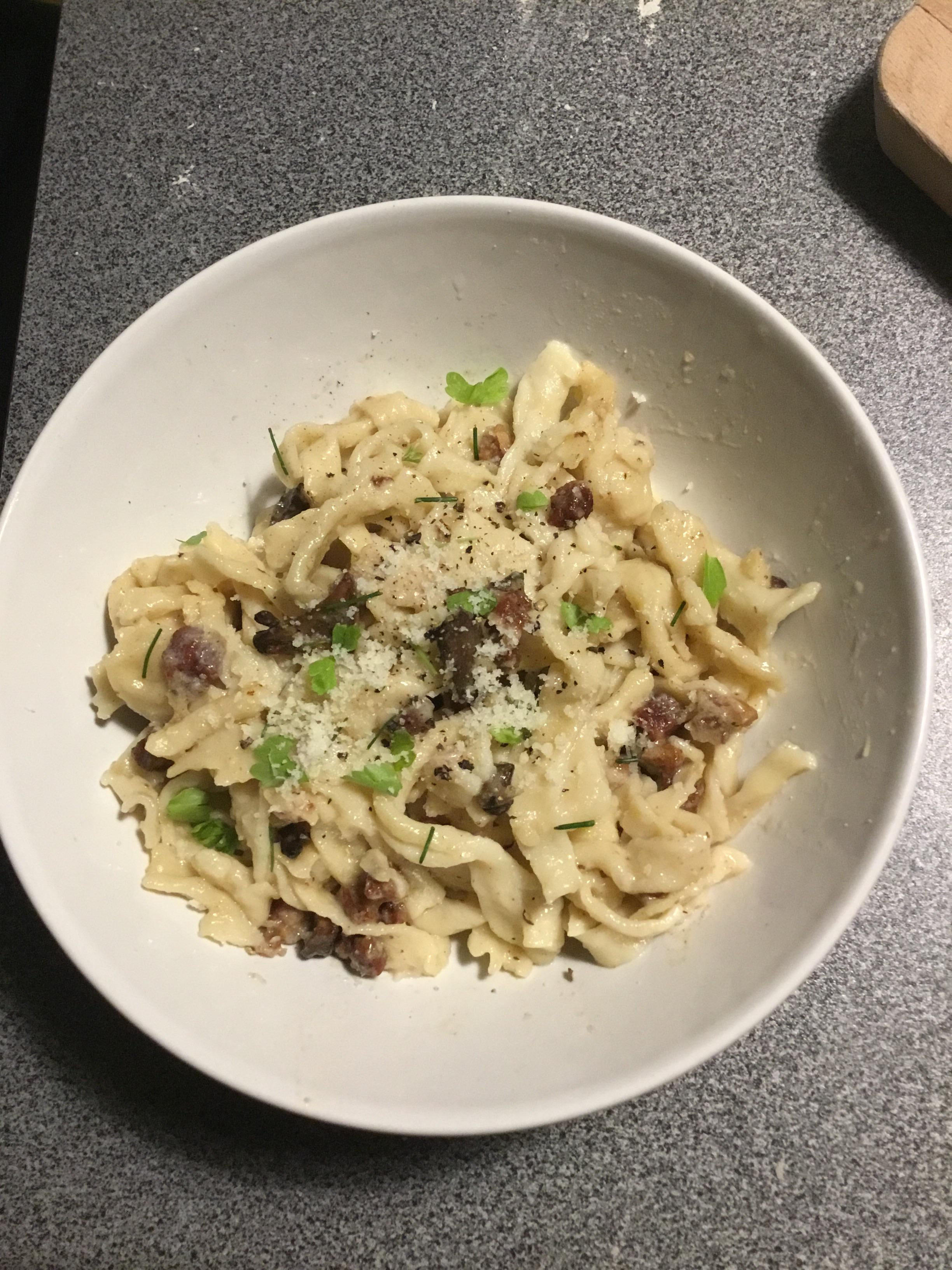 One of our wedding gifts was a pasta machine, and you know we just HAD to try it out. I had a good chunk of taleggio left over from my cheese board last night, and I found an awesome and easy recipe for pasta sauce (Recipe link here: https://zellipasta.com/blogs/recipes/dop-tallegio-sauce) that’s basically just taleggio and pasta water. I sautéed bacon and mushrooms to add to the pasta, and I think it definitely complements the earthiness of the cheese. I also garnished with chives and parsley from my garden, and a good squirt of fresh lemon juice.