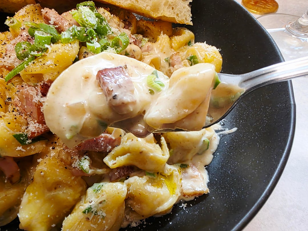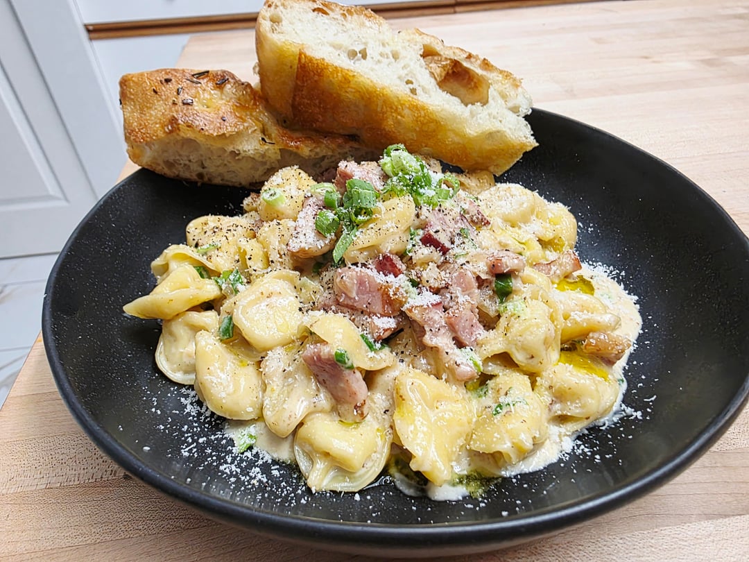 Simple cream sauce. Fairly lean bacon, some diced onion, garlic, white wine, cream, ParmReg, green onions. Resist the temptation to salt your pasta water.