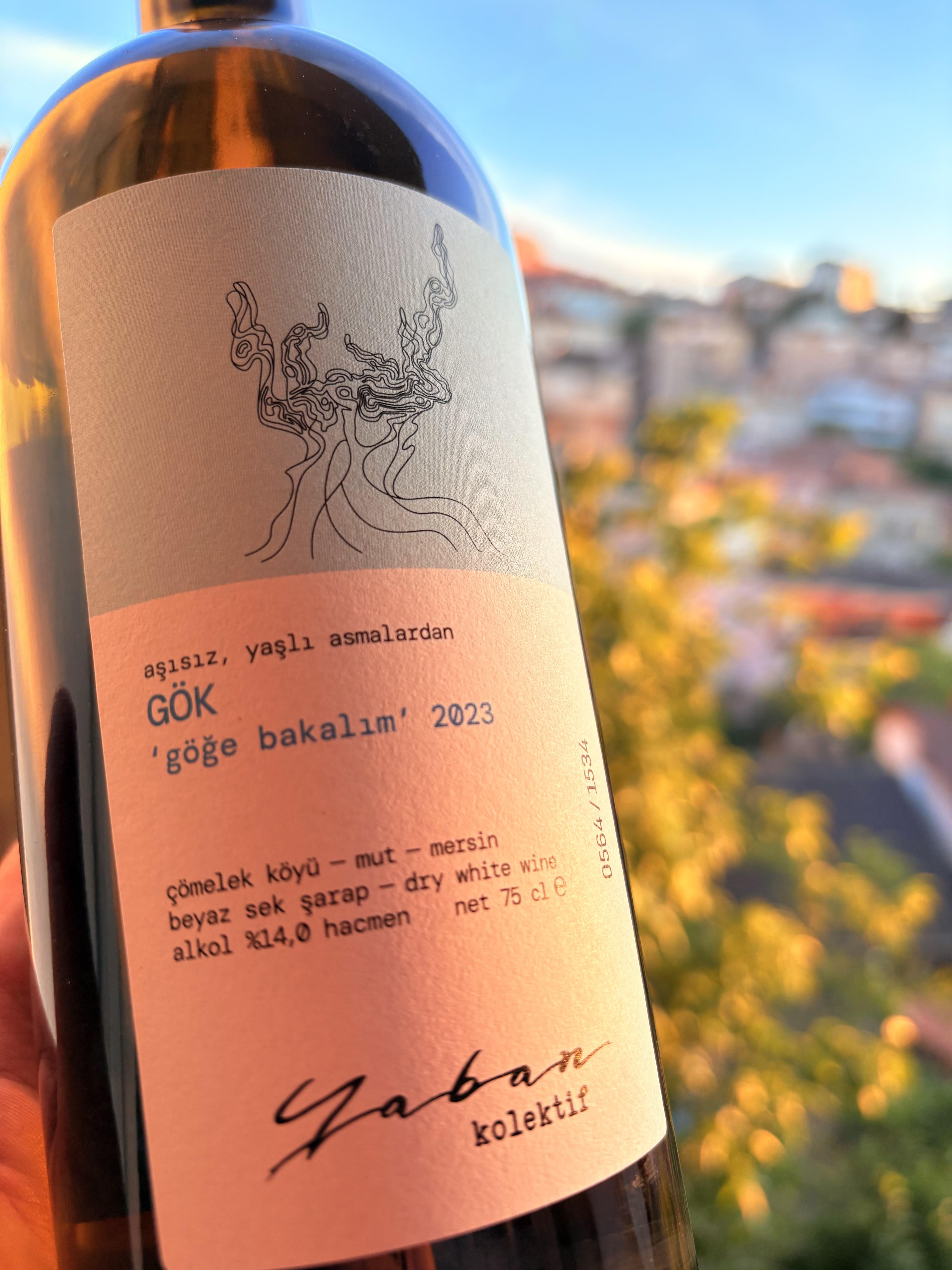 I opened a bottle at sunset today that made me think this could be an interesting question for the sub. The wine is called “Gök, göğe bakalım” 2023 from Yaban Kolektif. “Gök” means “sky” in Turkish, and the name comes from old, ungrafted vines in a small village called Çömelek, near Mut in the Mersin region of southern Turkey.