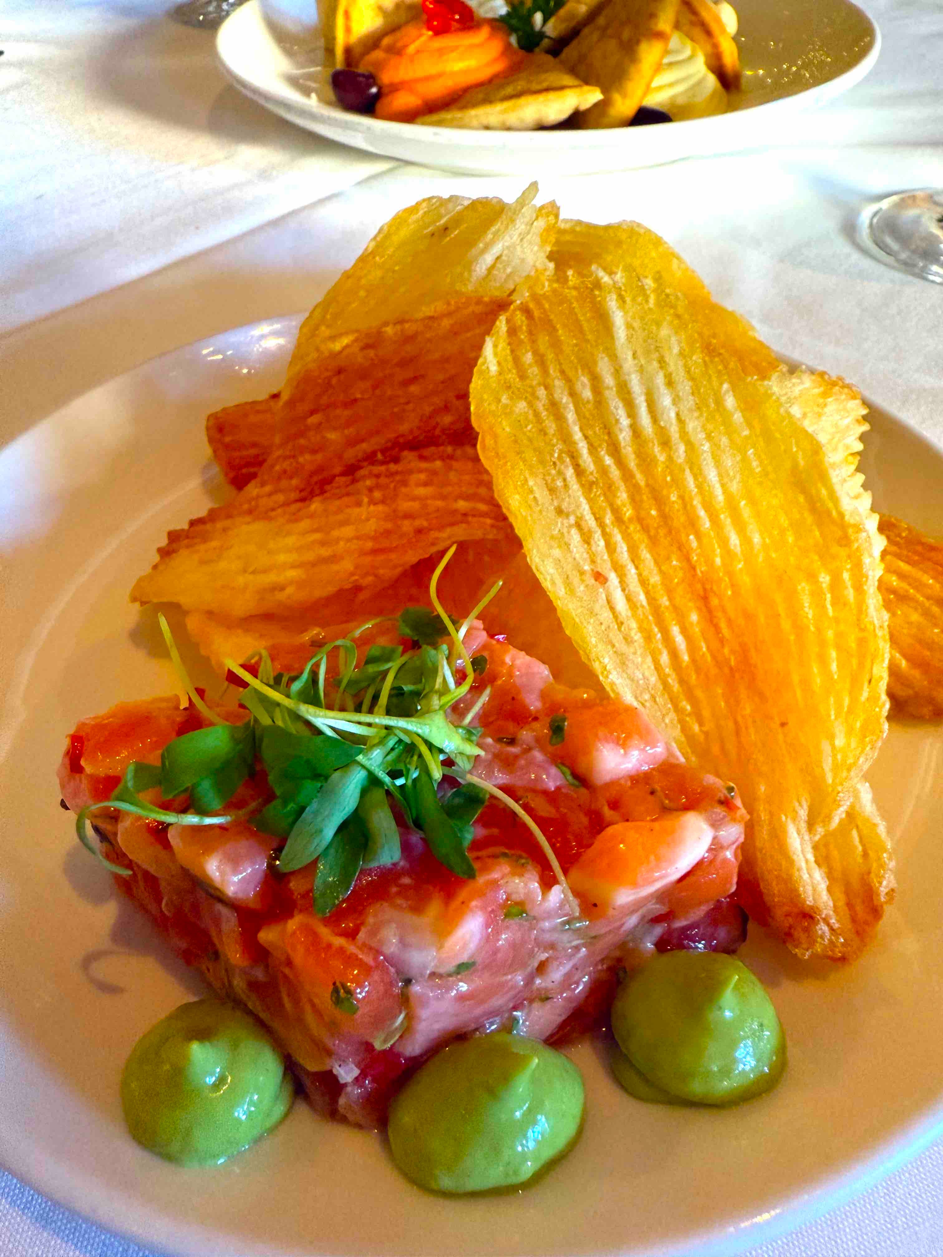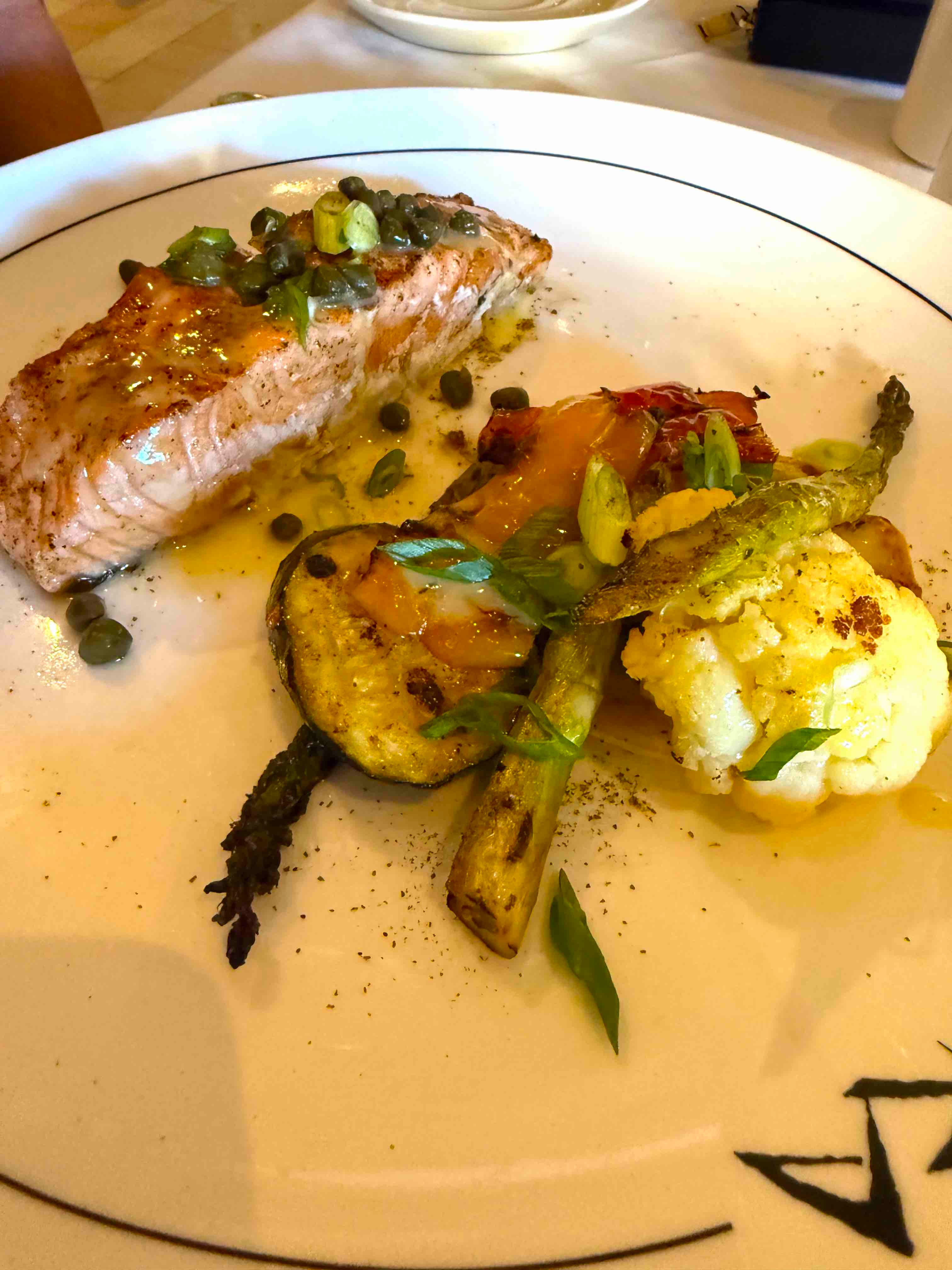 Main courses include a chopped salad; grilled salmon and vegetables; swordfish with warm potato salad; filet mignon; lamb chops, fish of the day; chicken with Greek oregano fries; tuna nicoise salad or pasta marinara. Desserts include baklava; a fruit plate or chocolate yogurt cheesecake.