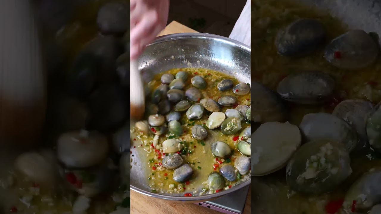 It always feels really special when I get to eat clams or pippies as we call them in Australia. And one of my favorite ways to prepare them is in a garlic butter sauce. I firstly want to drop my pippies into some cold water so they can purge any sand that they may have contained in their shells. Leave them to sit while you finally chop two large chilies. Mint six garlic cloves and finely chop some parsley. Give the pippies a drain once you have prepared everything for the sauce. Now, this sauce comes together so quickly. Melt some butter in a hot pan with a drizzle of olive oil and quickly fry off the garlic and chili. Add about a cup of white wine and then add the pippies to the pan. Cover and leave to steam for around 5 minutes or until all their shells open. Finish off with a sprinkling of parsley and a big squeeze of lemon. You can serve this with some crusty white bread, but I just love to eat them on their own and then drink the broth straight out of the bowl.