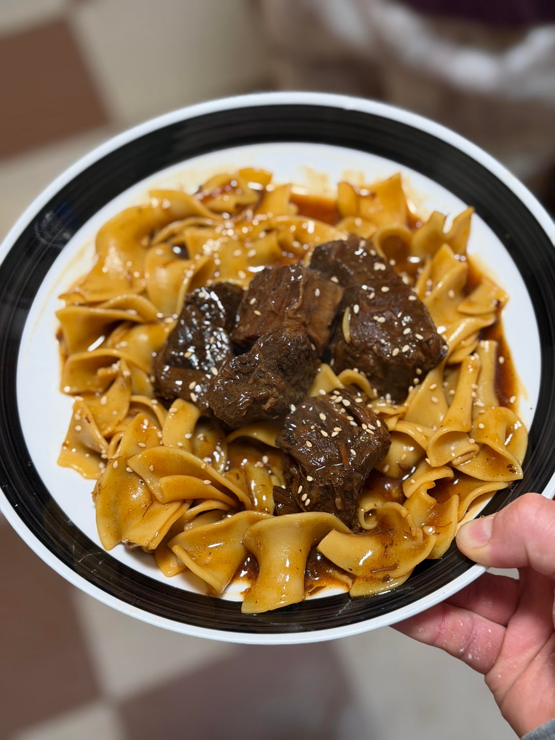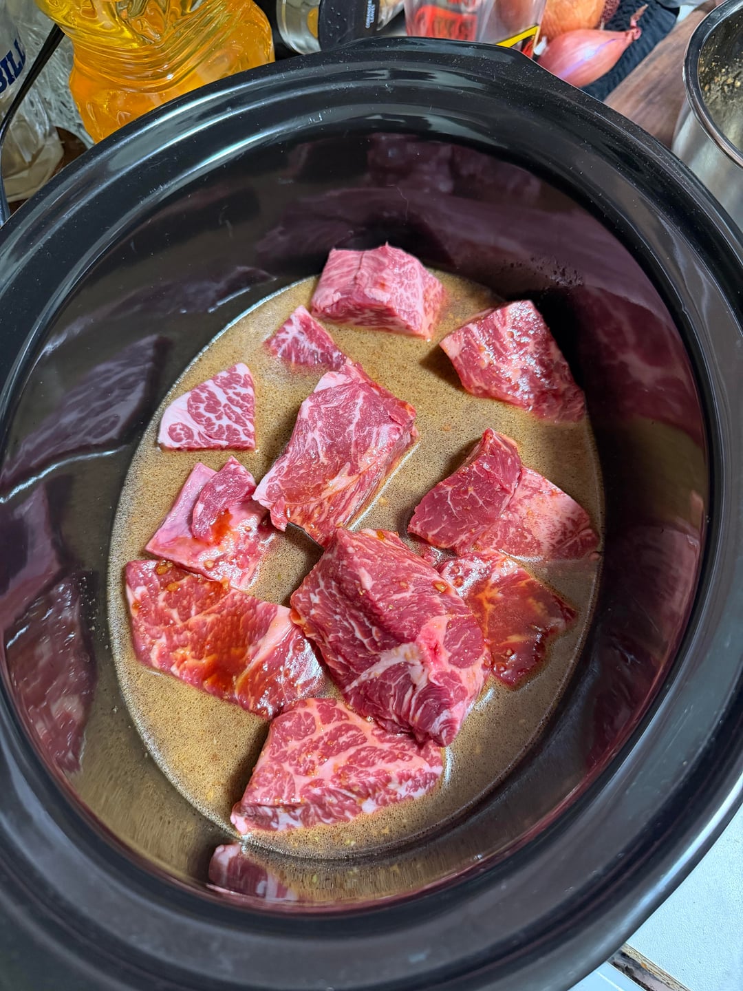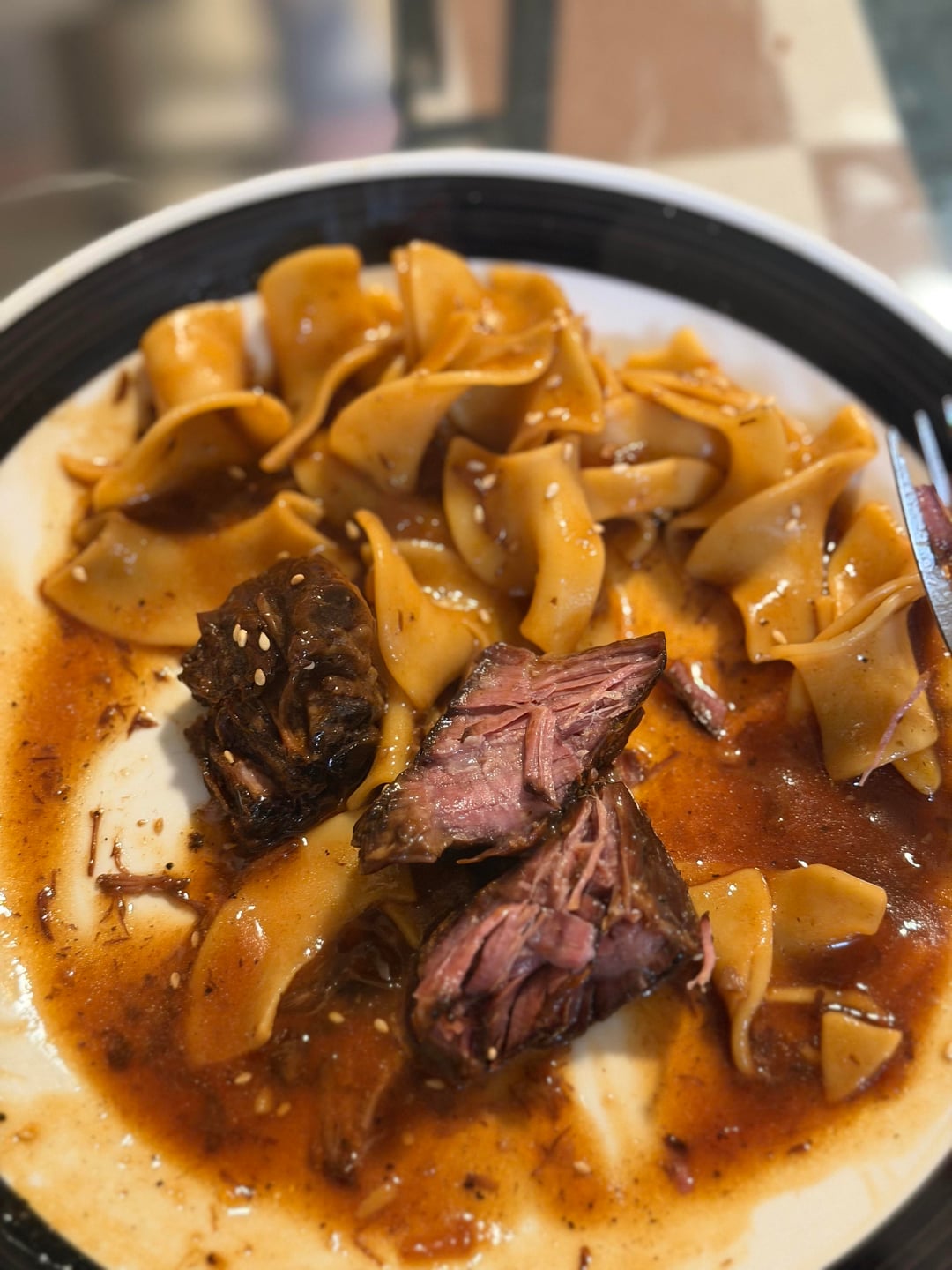 This came out fantastic. Cooked it 7 hours to be sure the fat rendered properly. Fell apart and melted. Decided to separate and reduce the sauce to make sure it had the proper consistency. Maybe coulda reduced it a tad more, but I was starving and oh well. I'll try to type a recipe out by tomorrow. Thanks for the ones who commented on my previous post telling me to buy this cut. Cheers!