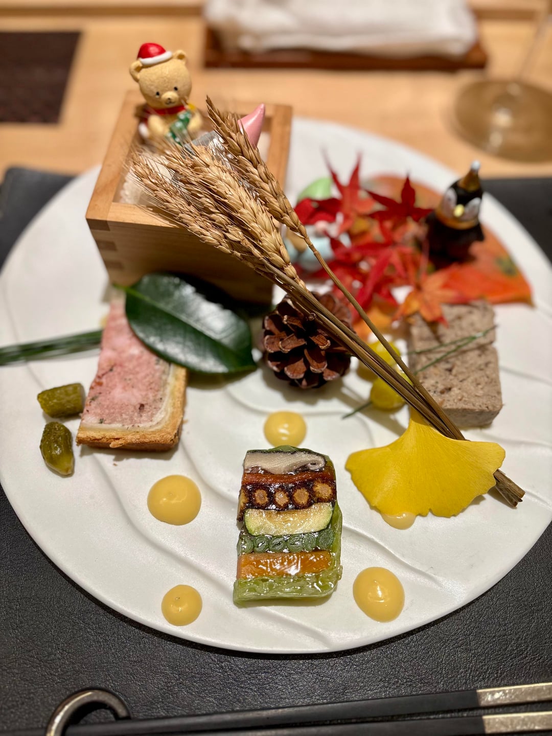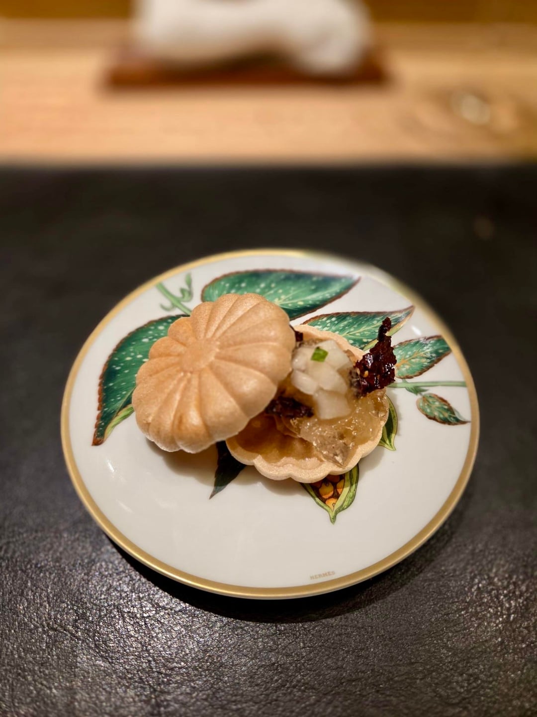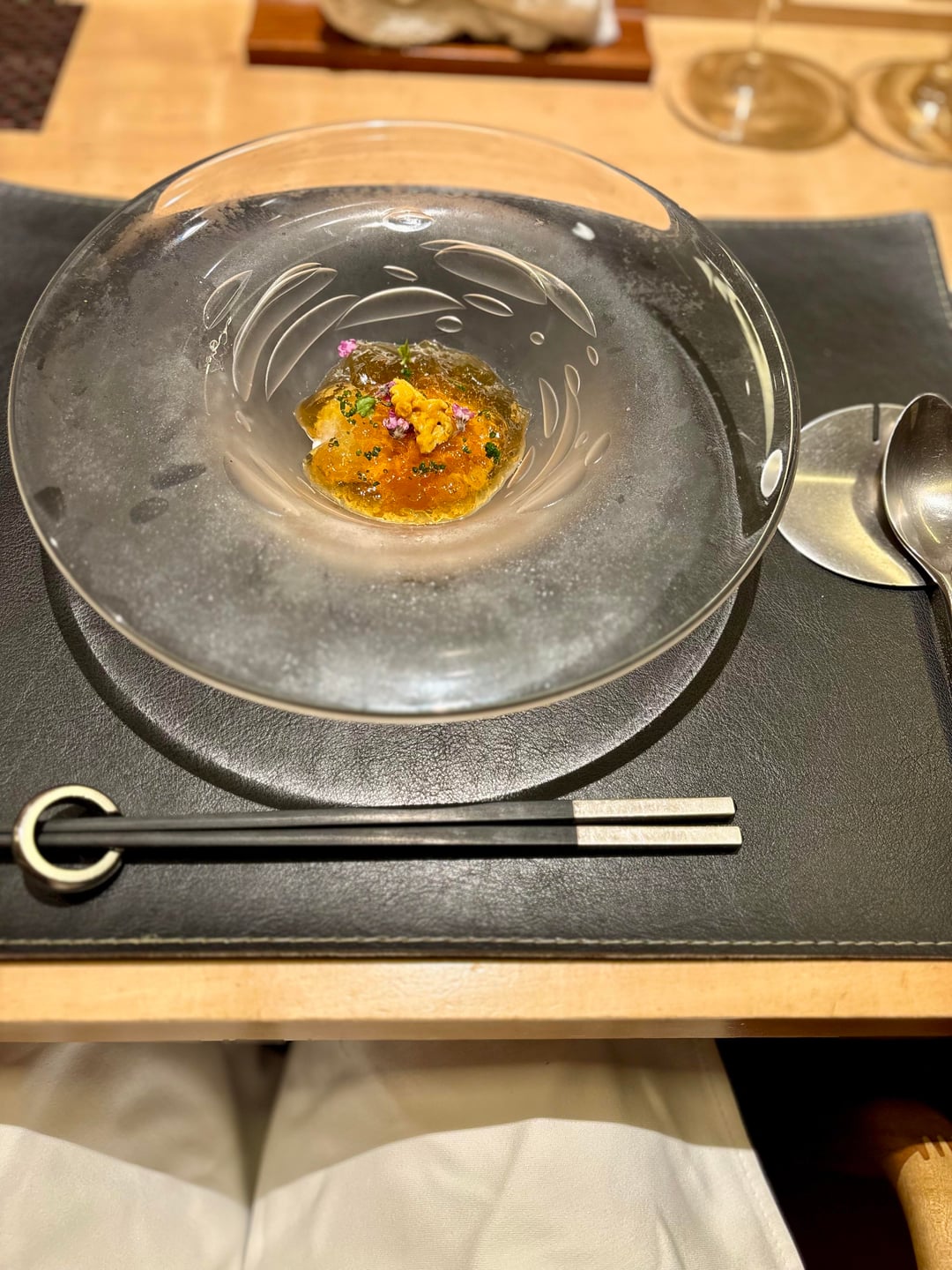 Included jellied vegetables, terrine, and ginkgo nuts. What stood out the most was watching the sous-chefs obsessively plate this dish—adding seasonal leaves, adjusting elements, then returning to adjust again. Fascinating to watch, though in this case less might have been more aesthetically.