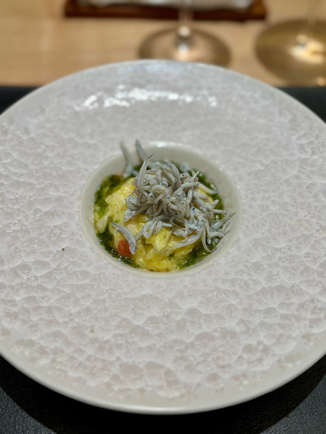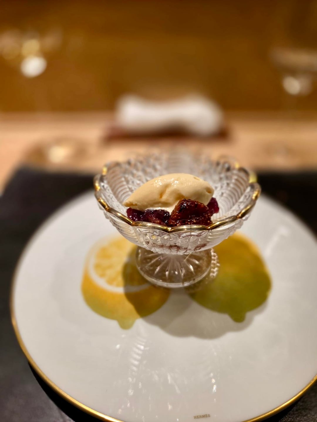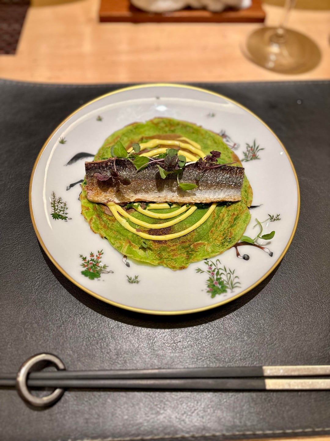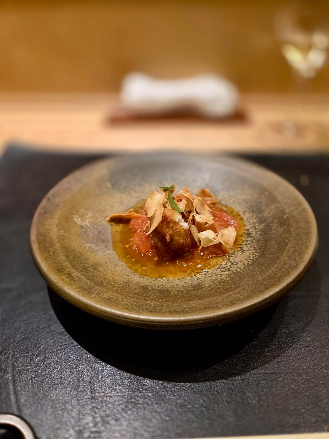 Included jellied vegetables, terrine, and ginkgo nuts. What stood out the most was watching the sous-chefs obsessively plate this dish—adding seasonal leaves, adjusting elements, then returning to adjust again. Fascinating to watch, though in this case less might have been more aesthetically.