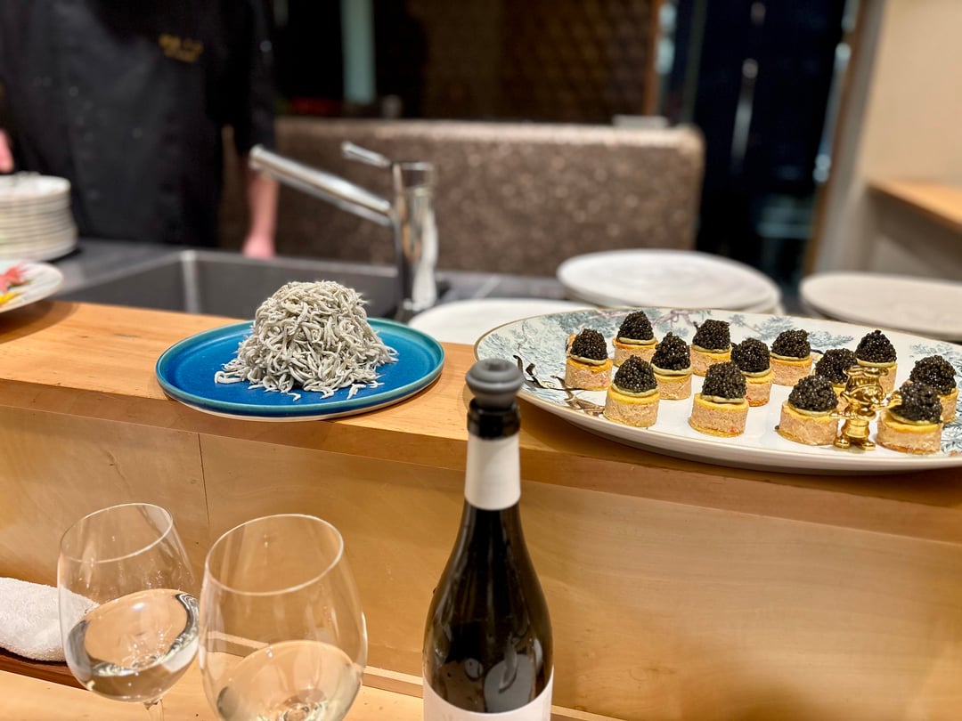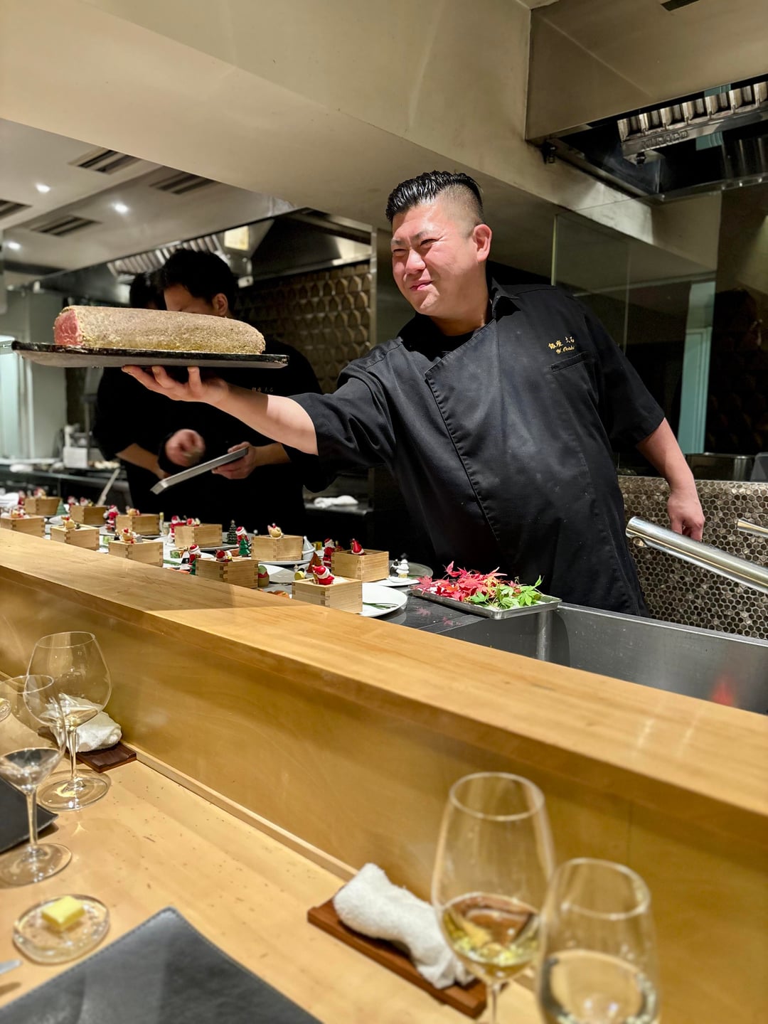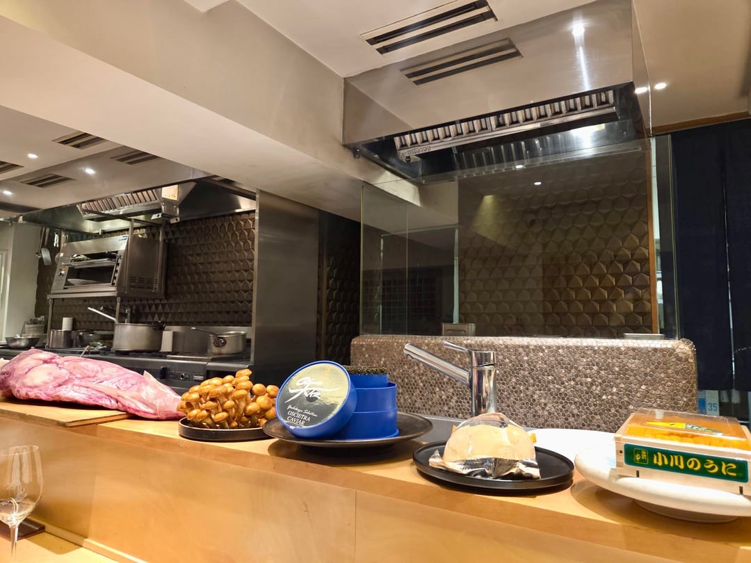 We were warmly welcomed by the chef as we entered the 12-seat counter. We chose two seats slightly off-center so we could take everything in. There is absolutely a theatrical element to the experience. Before cooking even begins, the chefs present the ingredients and seasonal produce that will appear throughout the menu, which builds a surprising amount of anticipation.