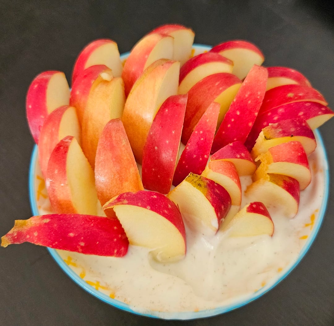 Greek yogurt with cinammon and apple slices used instead of spoon.