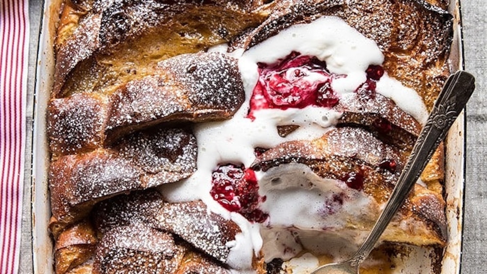 Baked Cinnamon Crème Brûlée French Toast with Raspberry Preserves