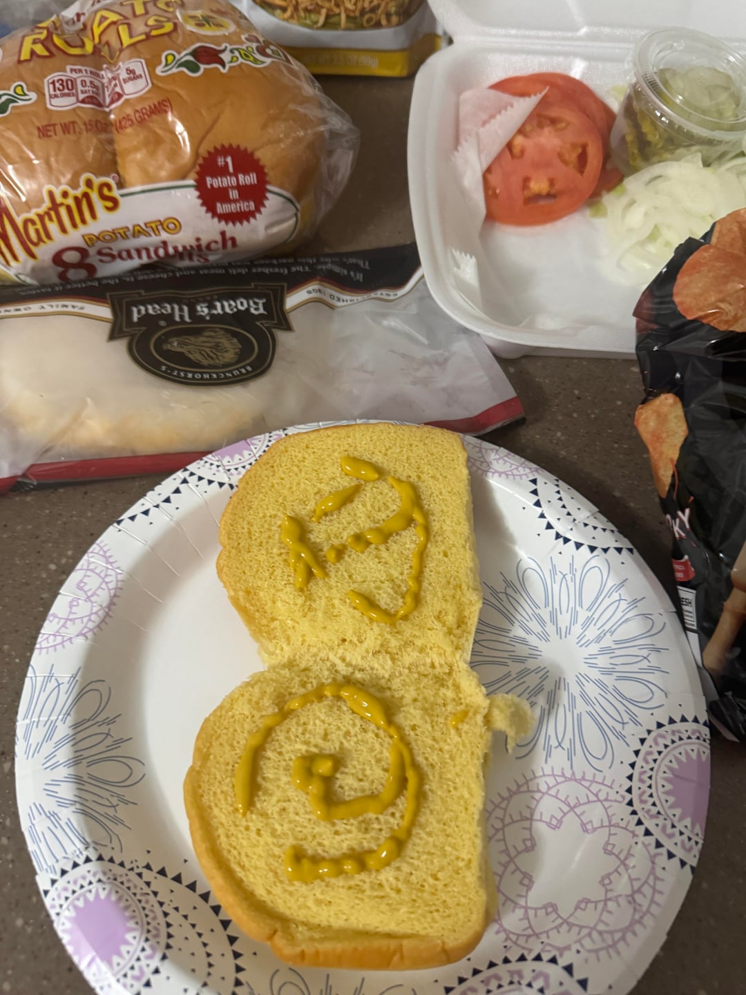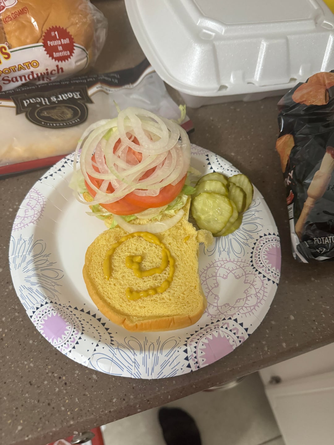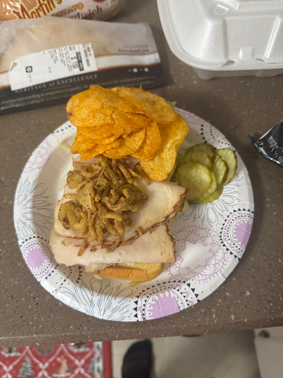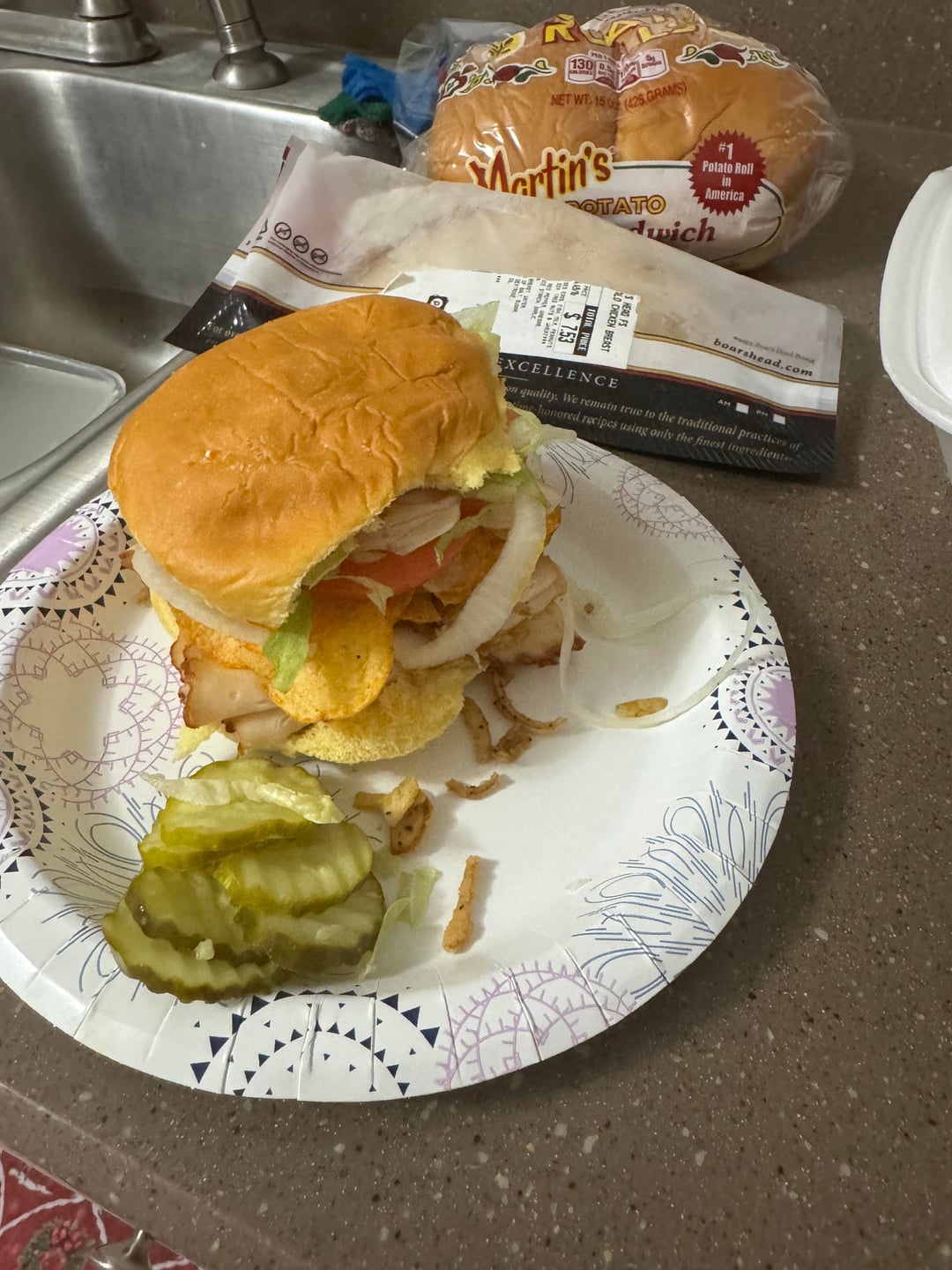 Buffalo chicken lunch meat, yellow mustard, LTO, crispy onions, BBQ Lays. I ended up taking off the T, wasn’t hittin like I wanted, after, smashhhhh!