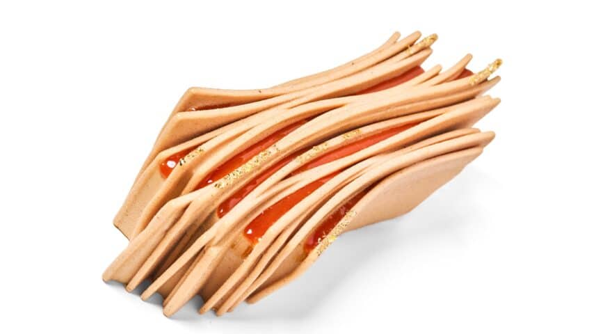 Beneath a shell of 60% Peruvian milk chocolate lie thirteen successive layers of woody textures and flavours: cedar-wood roasted rice mousse, pine nut praline, pine honeydew dulce de leche, Japanese cookie, glutinous rice cream… All resting on a breakable tablet-like base, with puffed rice, fluffy praline and vanilla semi-salt caramel.