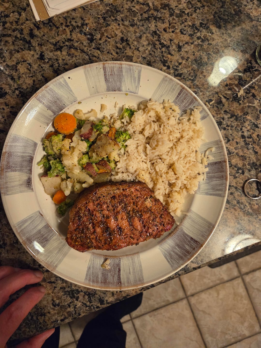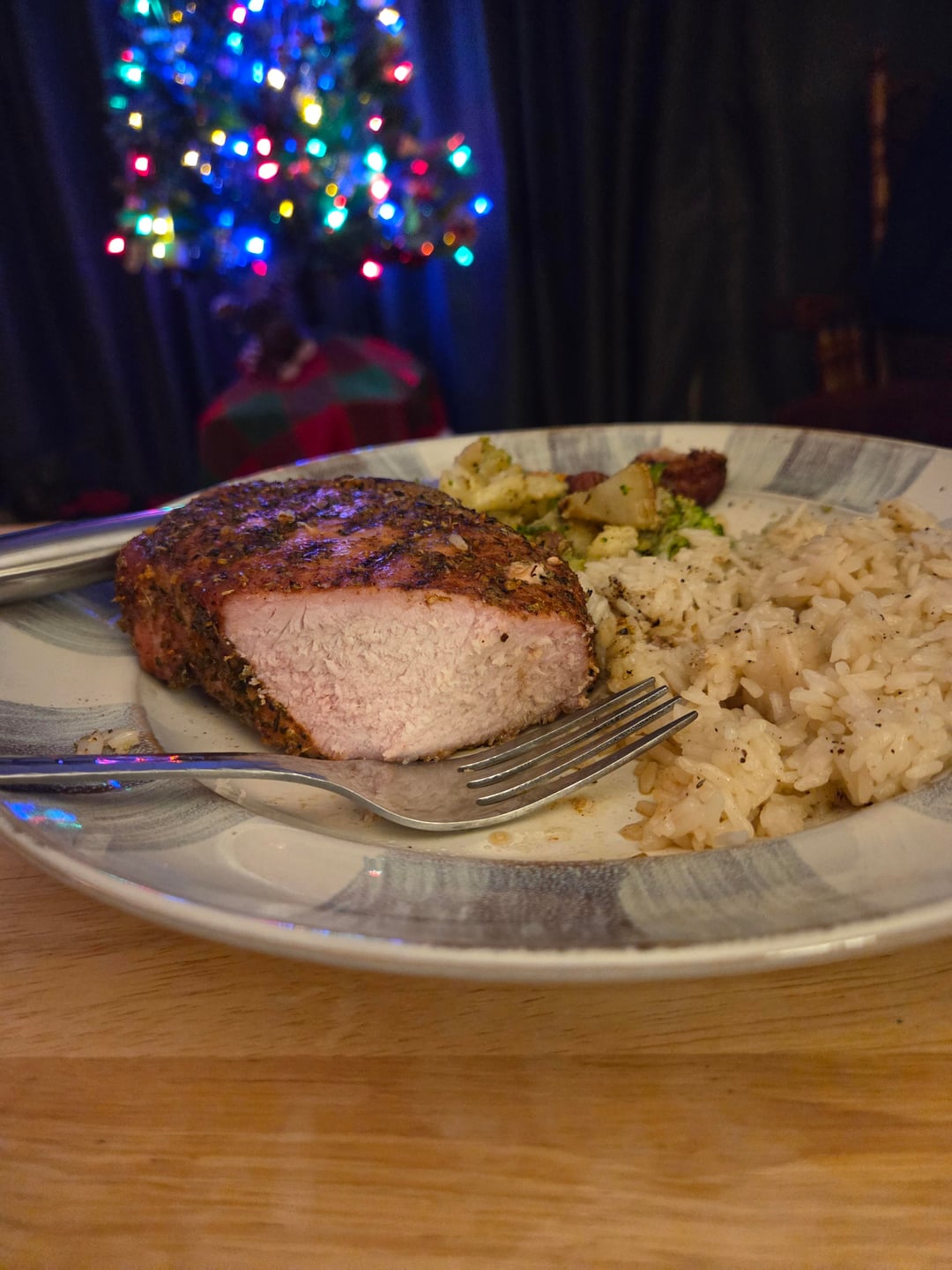 a quick pork night. sea salt, Italian medley, applewood rub on pork. jasmine rice. some random steamable. not hungry anymore.