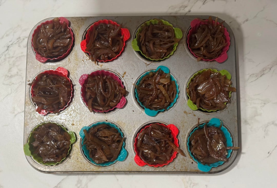 The second photo shows my storage process. I portion them in silicone cupcake liners and then save them in a freezer bag. I defrost briefly (~30s) in the microwave and then finish them on whatever cooking method I’m using for the rest of the meal. They save for a few months. I’ve also added Worcestershire or soy sauce for flavor in the past.
