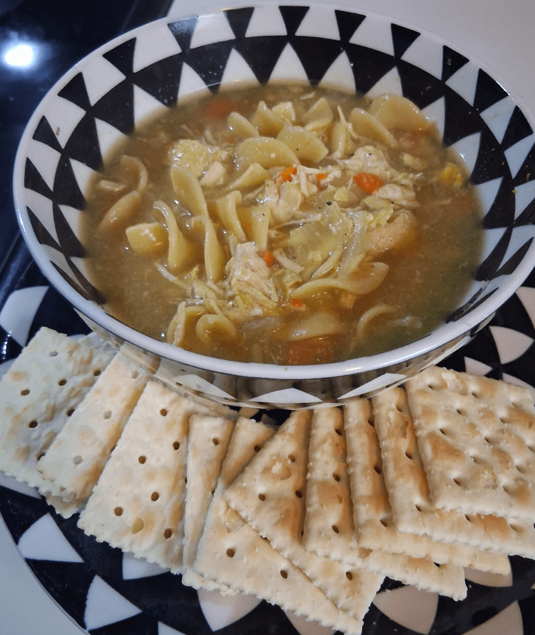 Chicken noodle soup requested by sick husband, added ground ginger, coriander, and turmeric for an extra sumthin