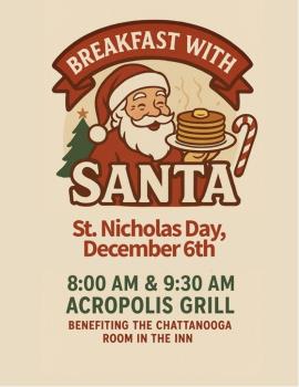 Chattanooga Room in the Inn is partnering with Acropolis Mediterranean Grill for a “St. Nicholas Day Breakfast with Santa.” The event takes place this Saturday, with two seatings at 8 a.m. and 9:30 a.m. at Acropolis Mediterranean Grill, 2213 Hamilton Place Blvd.