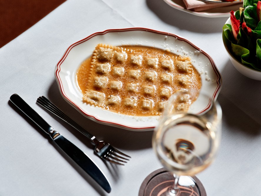 Signatures include piatto di pasta, a single sheet of ravioli stuffed with funghi and served in brown butter, and conchiglie al forno in spicy vodka sauce presented in a retro silver dish.