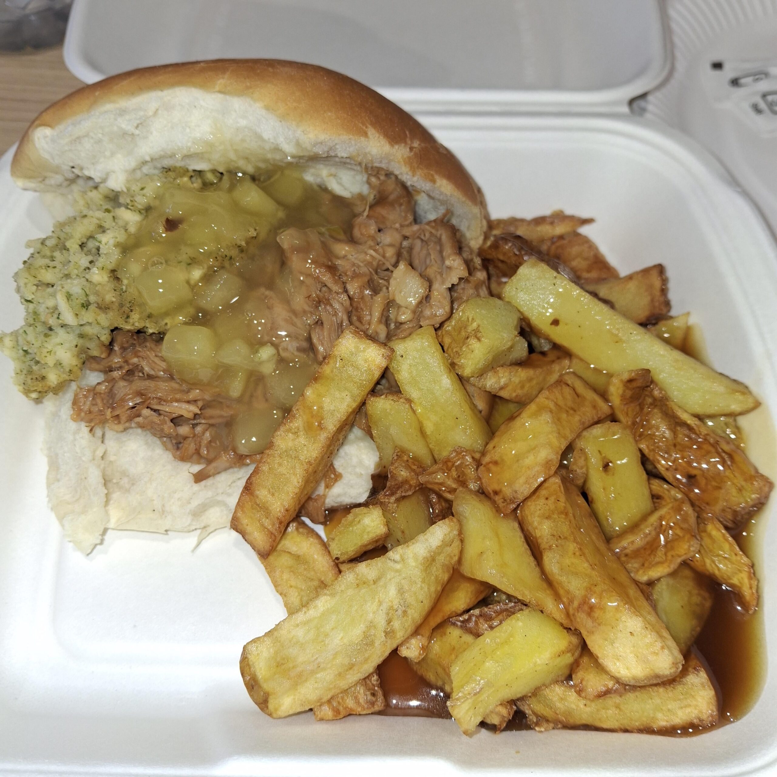 Pulled pork stuffing and apple sauce sarnie, with chips and gravy. by cerealkillerchef Dining and Cooking