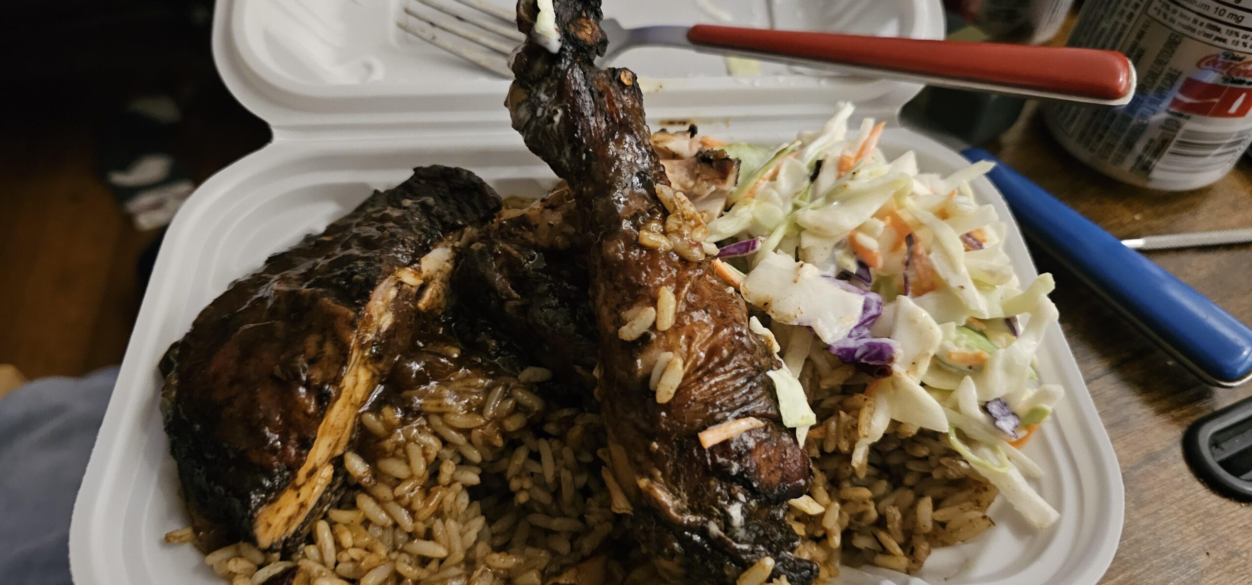 Jerk Chicken with peas and rice and coleslaw. $10! I devoured it.