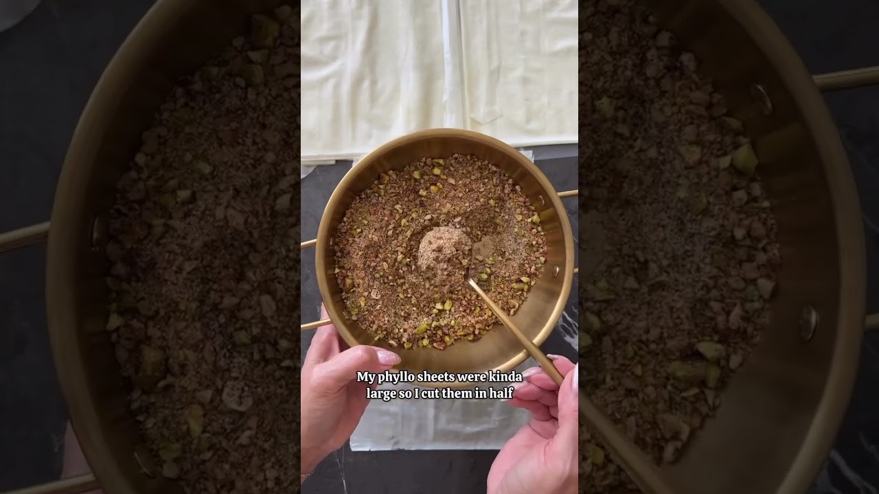 Crispy, flavorful, and most importantly, sweet. M sweet sweet baklava sticks. Most people know baklava, but have you ever heard of a baklava stick? You got to stick around because these are truly addicting. Recipe starts by preparing a simple nut filling. You can use assorted nuts like I did, or just choose one of your favorites. Toss the crushed nuts with a little bit of sugar and cinnamon and that’s it. I know fo dough can feel intimidating. It tears, it dries up. But trust me, if you follow these steps, you’ll see just how simple it is to work with. My fellow sheets were kind of large, so I cut them in half. I take one sheet, give it a little spray of oil, then sprinkle on the nut mixture. Using your hands, push the dough from the bottom up, so crinkles up like an accordion. Then place it straight into your pan. You might be wondering why I’m using oil instead of traditional melted butter, but I found that oil works just as beautifully, and it’s a great option if you’re looking to make this dessert dairyf free. Right before baking, I just cut them down the center, give them one more light spray, and into the oven they go, which gives me the perfect window to prepare the rose water syrup. Once they’re baked, I pour over the warm syrup. The syrup seeps into every fold, drenching them in that fragrant flavor. The result is a gorgeous dessert just in time for the sweet new year of Oasha Chenna. And trust me when I tell you, everyone at your table will be going back for seconds and thirds.
