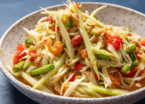 There are tons of variations, some people mix in cabbage, carrots, or cucumber, while others keep it classic with just shredded green papaya. The dressing is the key: fish sauce, lime juice, and a bit of palm sugar for balance. It is also known as som tam or papaya salad because it is often served with a papaya salad dressing.