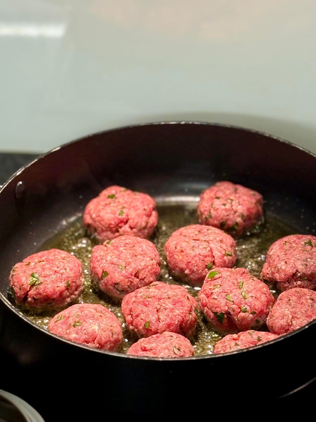500g minced meat (2/3 beef, 1/3 pork); 60g breadcrumbs; 80g grated parmigiano; 1 medium egg, parsley, salt and pepper. Mix in a bowl, refrigerate for 30 mins. Form balls. And fry in olive oil for about 7 mins.