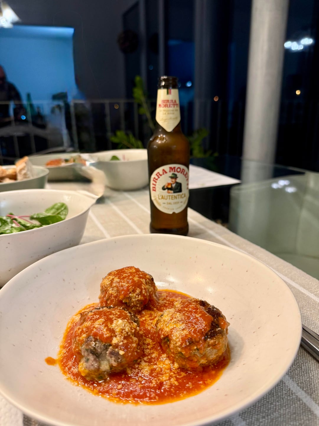In parallel, make your basic tomato sauce. Once done, dump the polpette in and simmer on low heat with lid on for a couple of minutes.