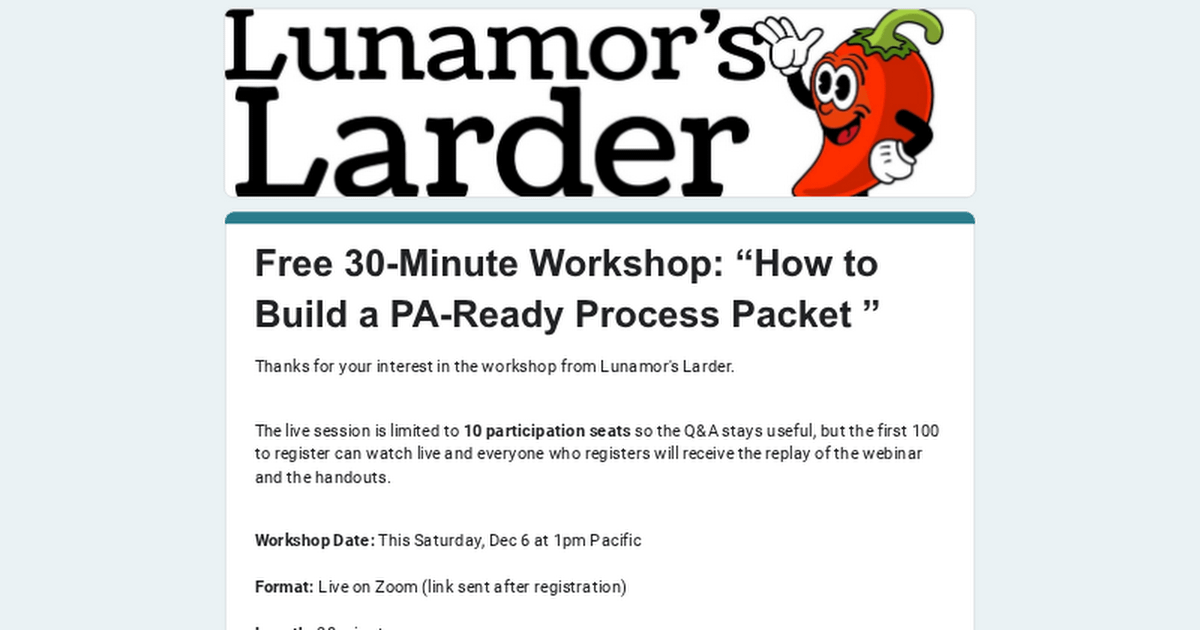 Hey Sauce Makers: A few folks from the last free workshop I ran (5 Expensive Mistakes to Fix Before You Pay a Process Authority) asked for a follow up on how to pull together a full Process Authority packet, so I am hosting a free 30 minute session on it this weekend on Saturday, Dec 6 at 1pm Pacific.