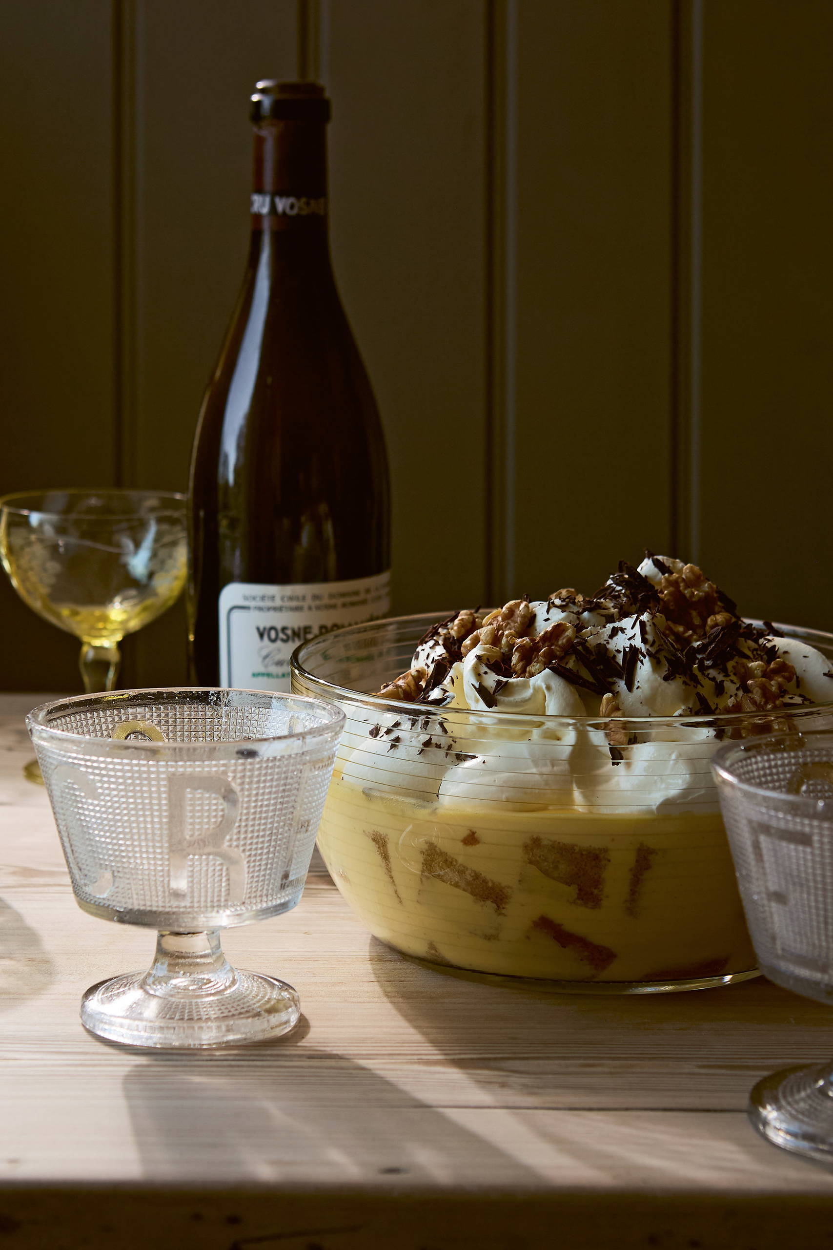 Melt the chocolate in the microwave and pour onto a plate to set hard. Using a teaspoon, make curls of chocolate and use these to decorate the trifle along with the crumbled walnuts.