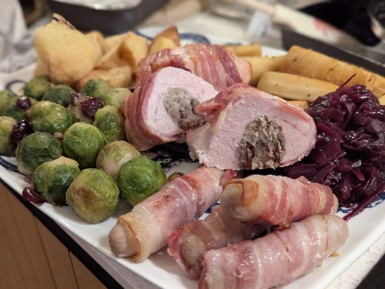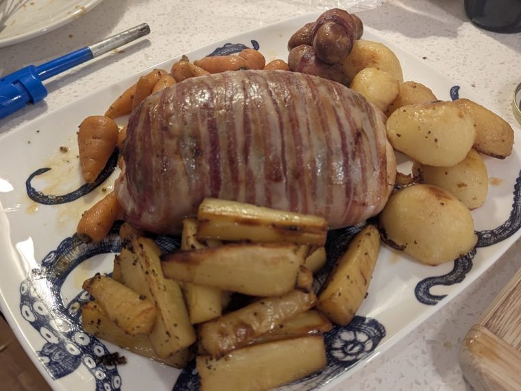 The turkey did look quite good when it came out of the oven. The bacon was a bit scorched, but nice and crispy, and the stuffing inside was generous. I don’t expect turkey to taste of much, that’s what the gravy and other sauces are for, but it was dry, too.