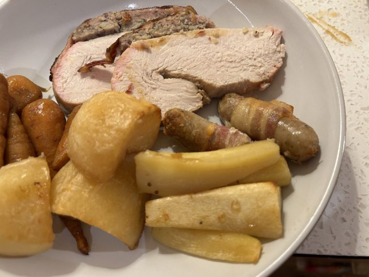 The turkey breast is a generous size for four and there’s plenty for seconds. The stuffing is more of a smear between the bacon and the turkey, though, so stuffing fans would need to buy extra. For a moment, I worry it is undercooked as it looks pink in spots, but I decide the colour is from the bacon and later read that this is indeed the case at the end of the instructions – a smart add from Sainsbury’s to allay any Christmas Day panic.