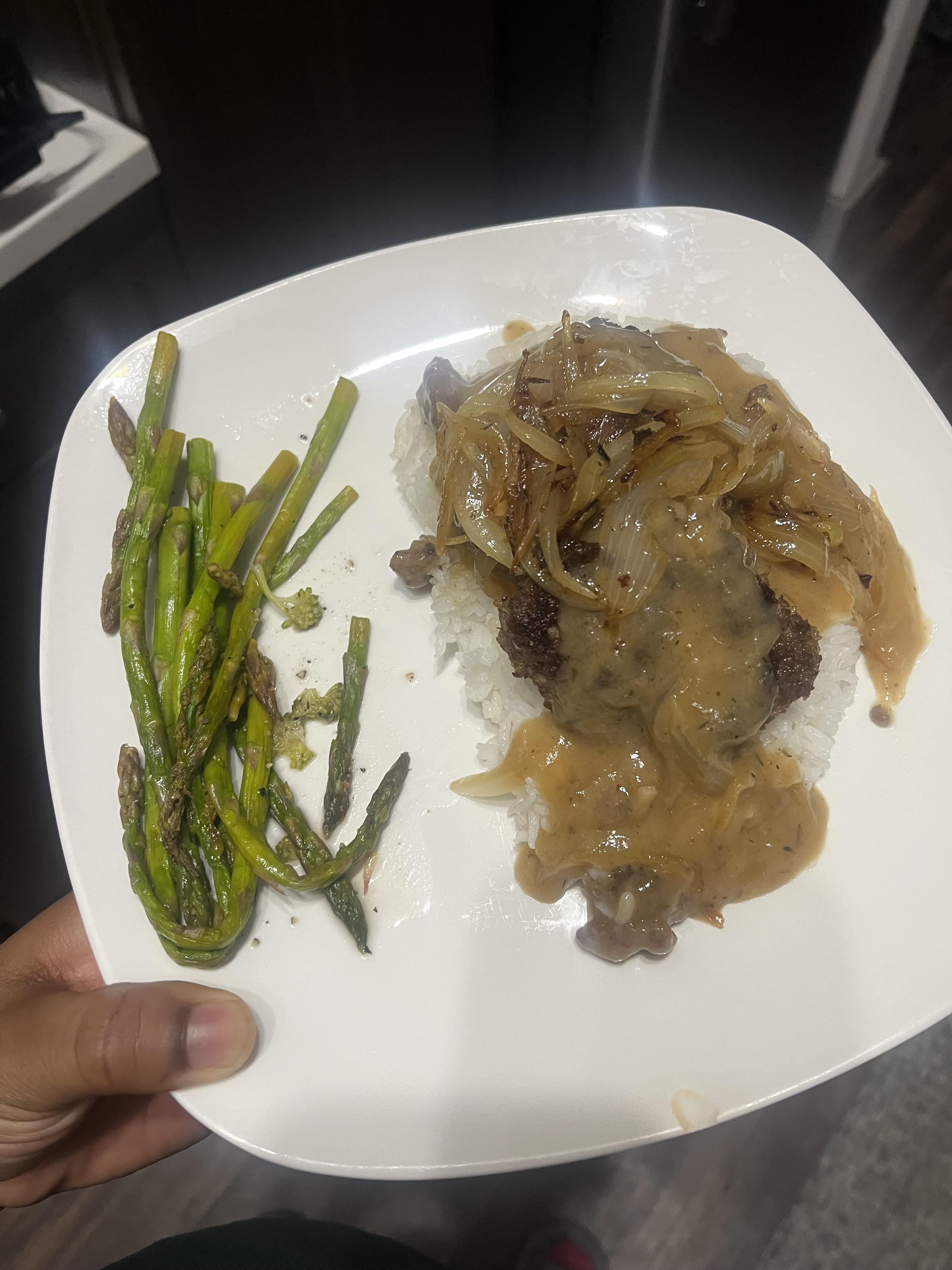 Salisbury steak with homemade gravy, over rice on the side asparagus. Topped with savory caramelized onions. I also made an apple cobbler for him for dessert, more of a southern thing. 💞