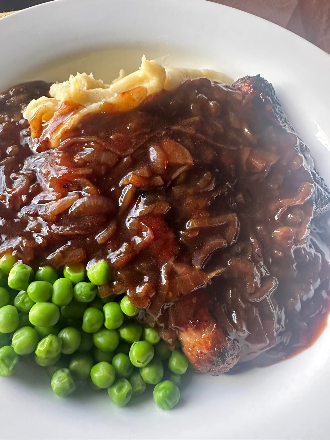 Sausage, mash, peas and lashings of onion gravy.