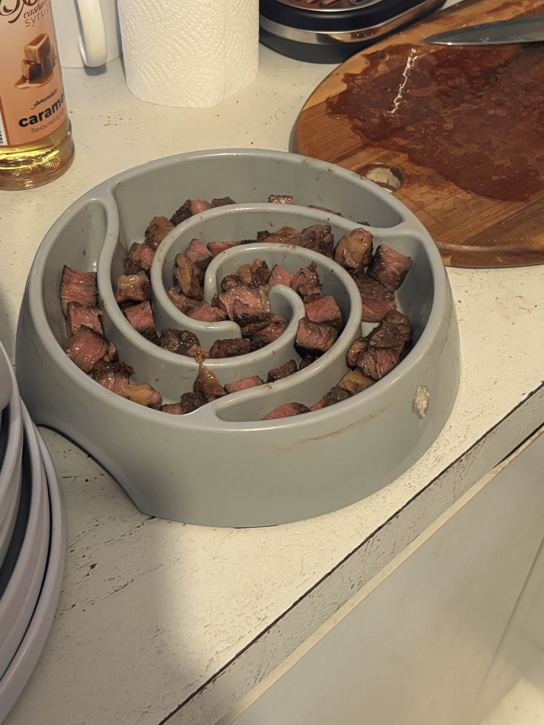 Tonight she has her first and last steak, a 320g scotch fillet cooked as best as I can manage, sous vide then pan seared. I let it rest for about 30-40 minutes, allowing it to cool before cubing it for her slow feeder. If not for the slow feeder, I think she still would have found a way to eat it whole.