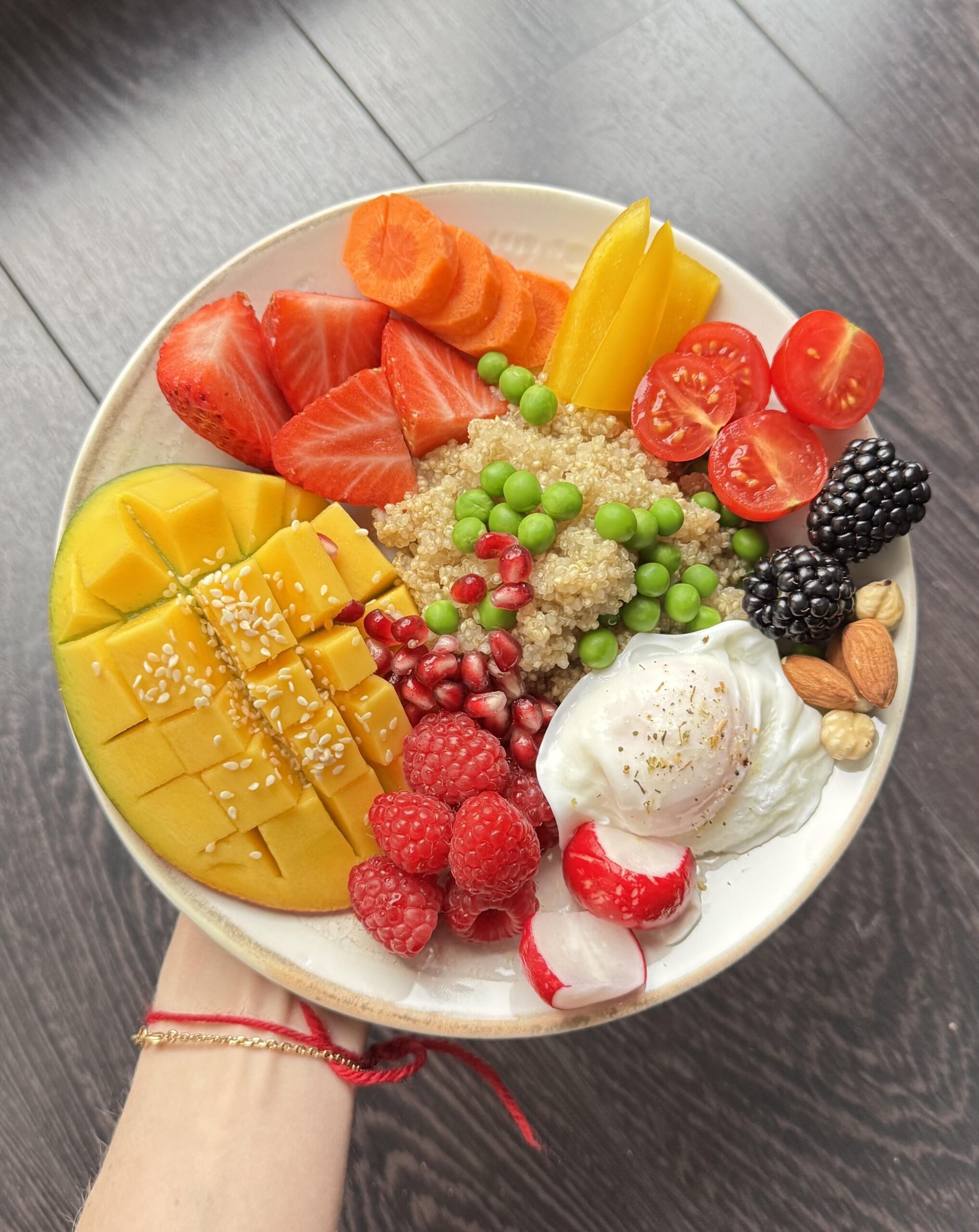 I’ve been sick for a few days and honestly can’t figure out what my body even wants to eat …(everything tastes weird), So I just threw together the most random „comfort bowl” I could come up with – quinoa, mango, berries, veggies, an egg (basically chaos😅, but!! colorful chaos🙃)