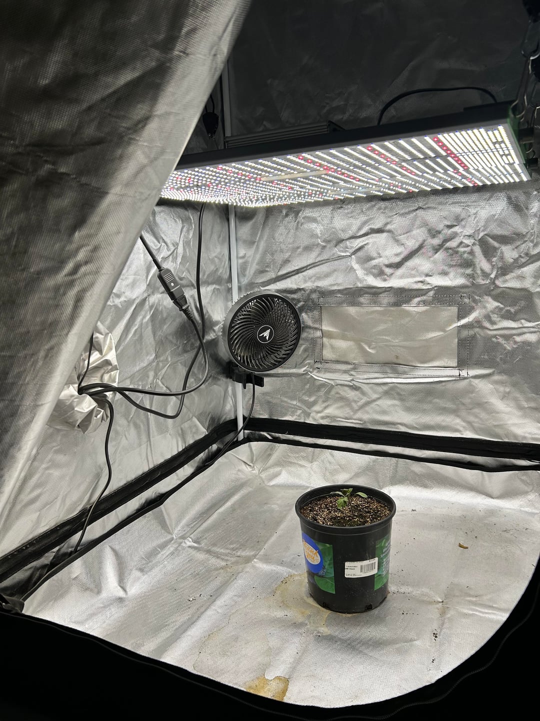 That being said, I figured I’d try my luck at an indoor grow this winter, purely as an experiment. Since I’ve harvested an over abundance of my wife’s “medication” lately, I have the grow tent unoccupied for the winter and want to grow something. I want to test not only how Brandywine in particular will grow with an indoor setup, but how it will do on purely “Jack’s 3-2-1” nutrients. My grow setup is a 3’x3’x6’ grow tent with 2x Viparspectra P2000 lights. One a 200w and the other a newer 250w version. I have a ventilation fan on the upper portion of the tent, and an intake vent on the lower, with an AC infinity oscillating fan on the “natural wind” setting. I started two seeds with a mycorrhizal inoculate in a 1ish gallon pot using used coast of Maine stonington blend soil, and wet it with full strength Jack’s. Germination took about 4-5 days under a dome with grow lights on 40% to provide warmth. Dome came off at first signs of germination, I cut the weaker of the two seedlings, and I’ve been watering with full strength Jack’s ever since. As of today, it’s been 1.5-2 weeks since germination.