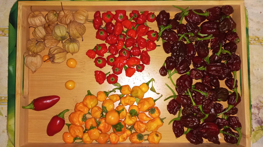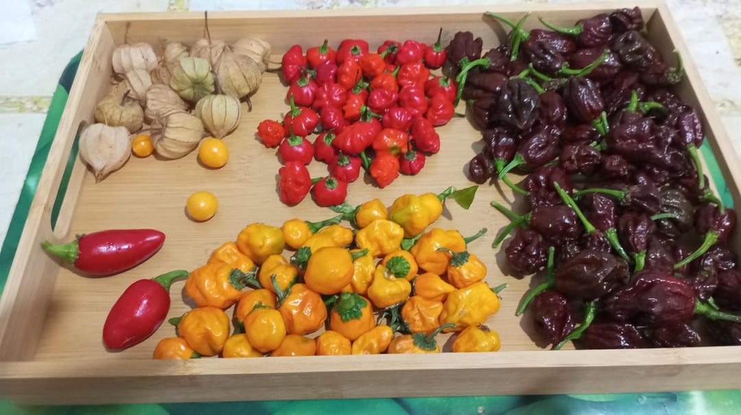 Pictured: Pysalis Aguaymanto, Brazilian Starfish, Jalapenos, Habanero Big Sun and a pile of Chocolate Reapers.
