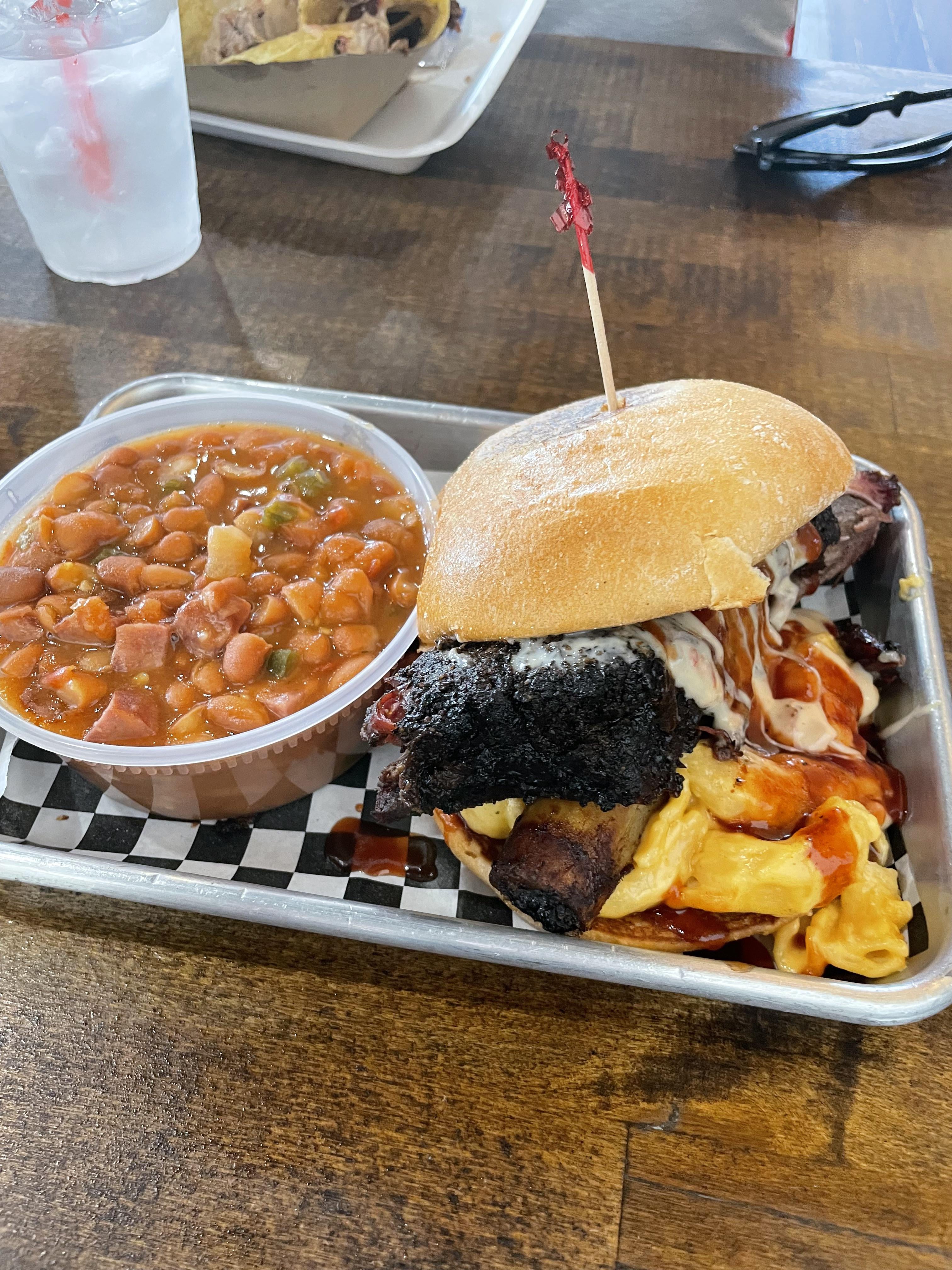 Beef dino rib sandwich on a bed of mac, topped with smoked queso and BBQ sauce. Side of Charro beans. 9/10