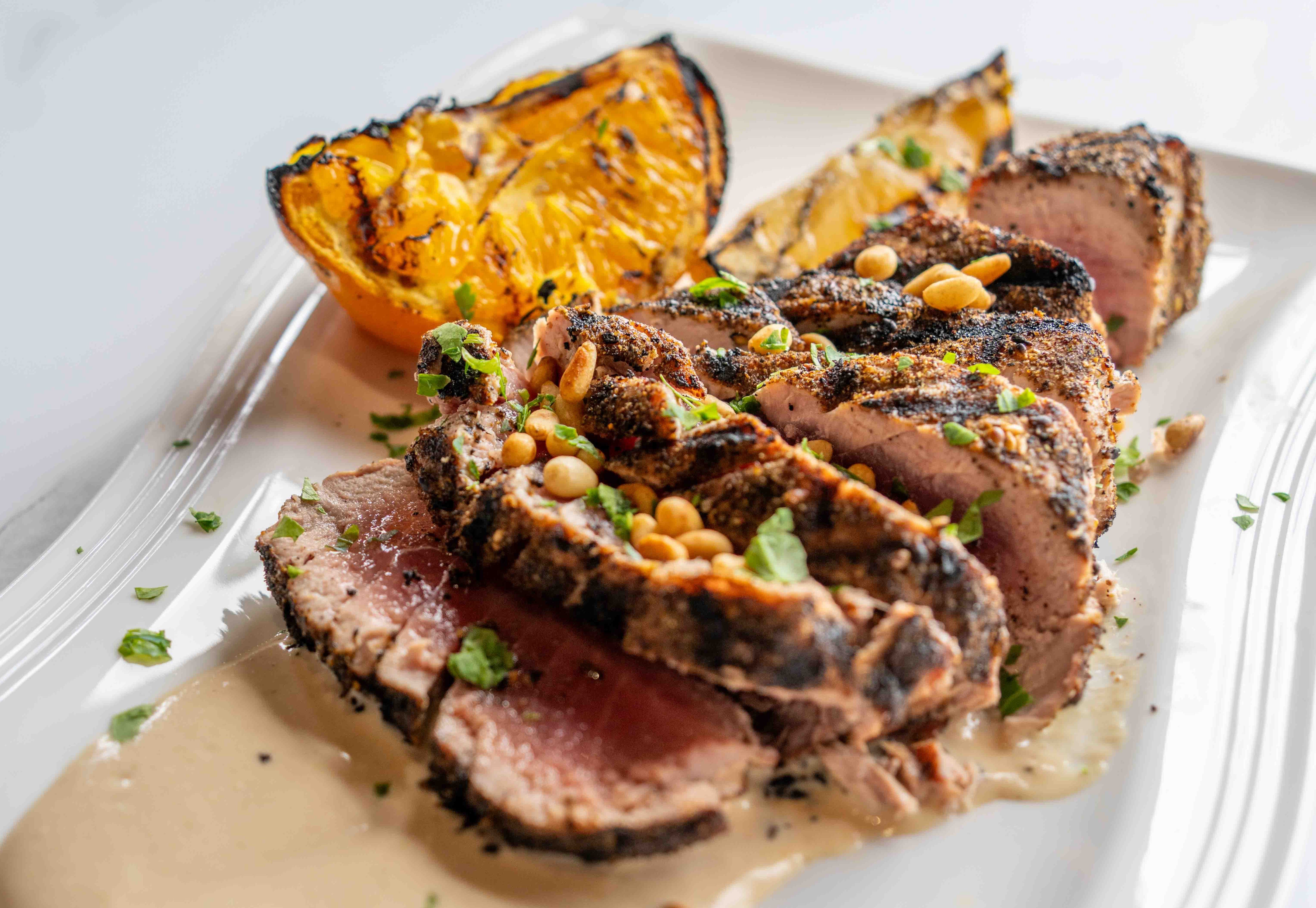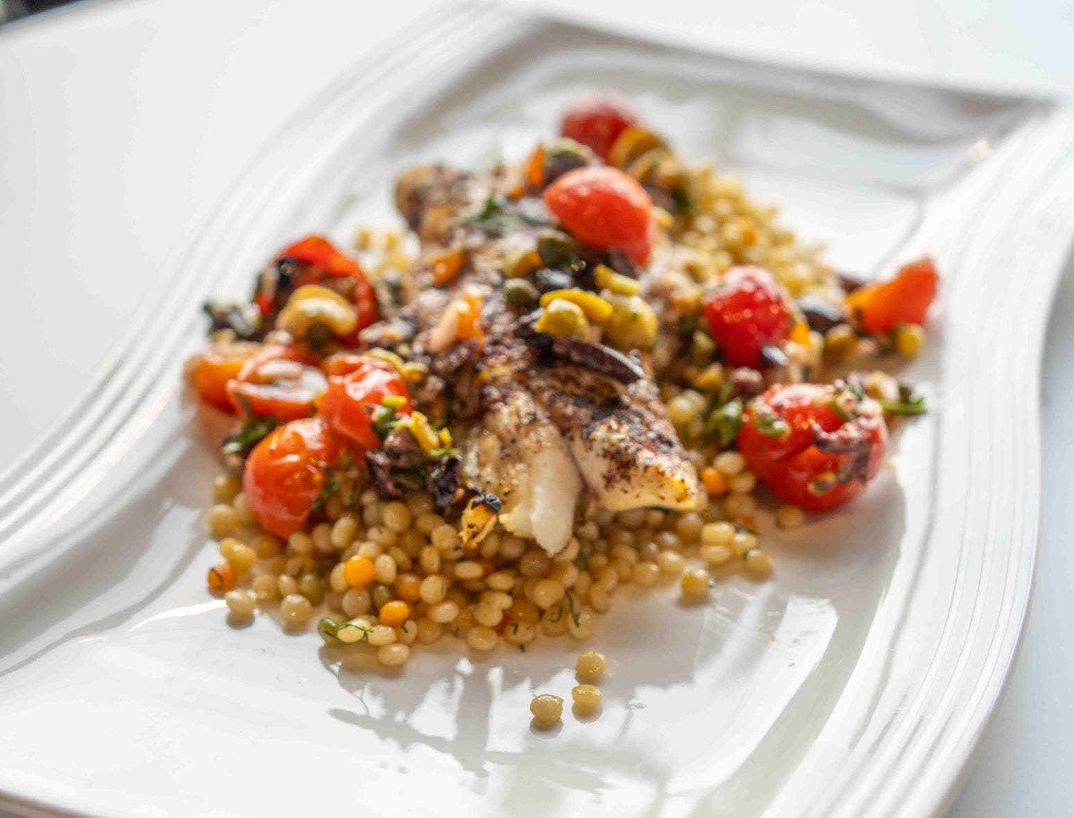 Za’atar Crusted Tuna Steak with charred citrus and tahiniMediterranean Meatballs (lamb & veal) with yogurt tahiniWhite Bean Sausage Tuscan Soup with sautéed kale and vegetablesMediterranean Chicken Burger topped with whipped feta and olive tapenadeKebab Gyros (chicken, steak, or lamb) served with hummus and signature LemonaizeFilet with Roasted Red Pepper Purée, olive tapenade, and herbed farroMediterranean Red Snapper with herbed couscous and tomato relish