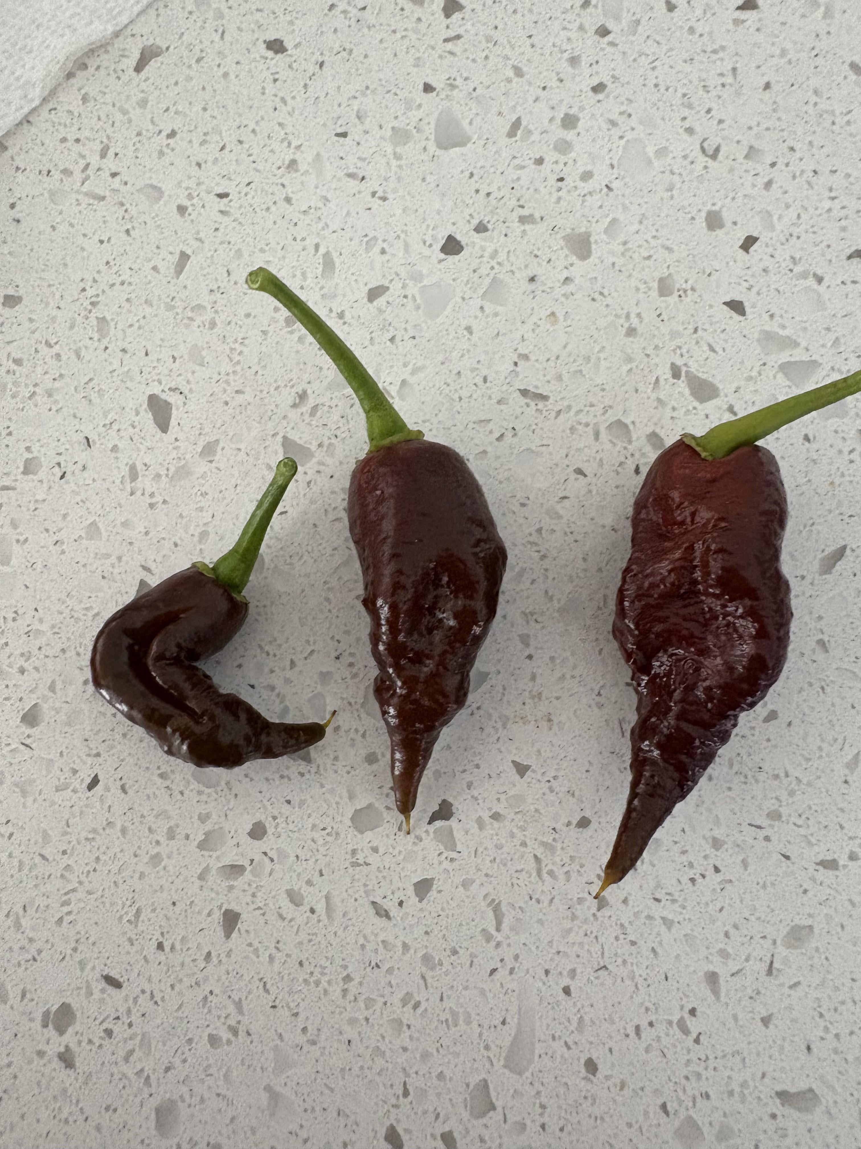 These were my chocolate reapers – those look more like ghosts. I believe they aren’t a stable variant yet so shape isn’t a great indicator but do they taste fruity and heat in your mouth (ghost) or slightly smoky and burn your chest and throat more (reapers.)?