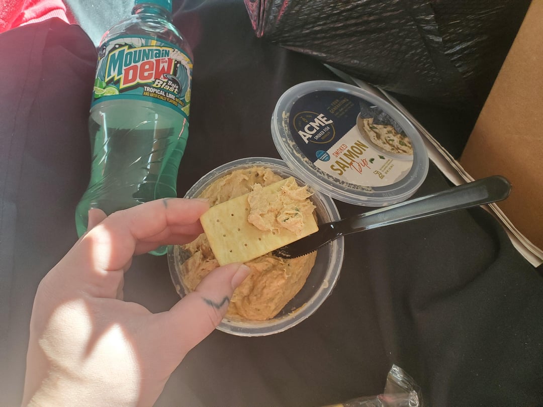 Looks like you managed to swing some real food though! Fresh fruit and salmon spread and peanut butter, hell yeah. Clearly you are resilient. Sending good mojo to you