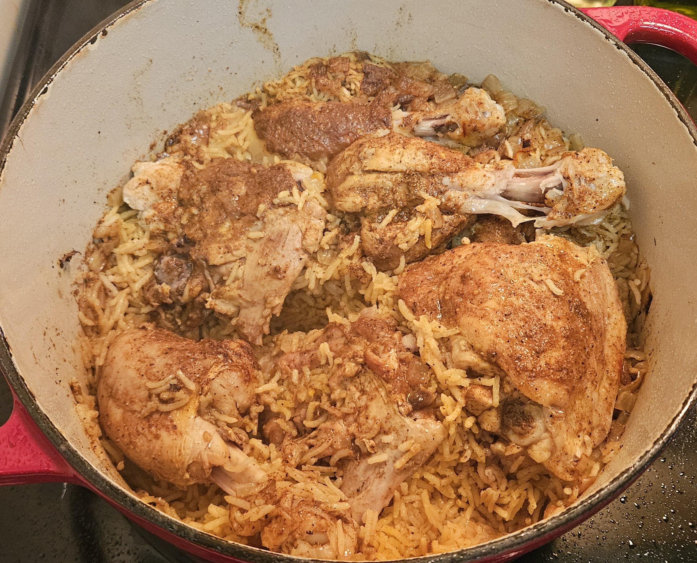 4) Add water, then gently place the chicken on top, making sure to add all the resting juices. Cover and cook on medium-low until the rice is tender, water is absorbed and chicken temps to at least 165° (I prefer about 175° for thighs, but 165° is safe).