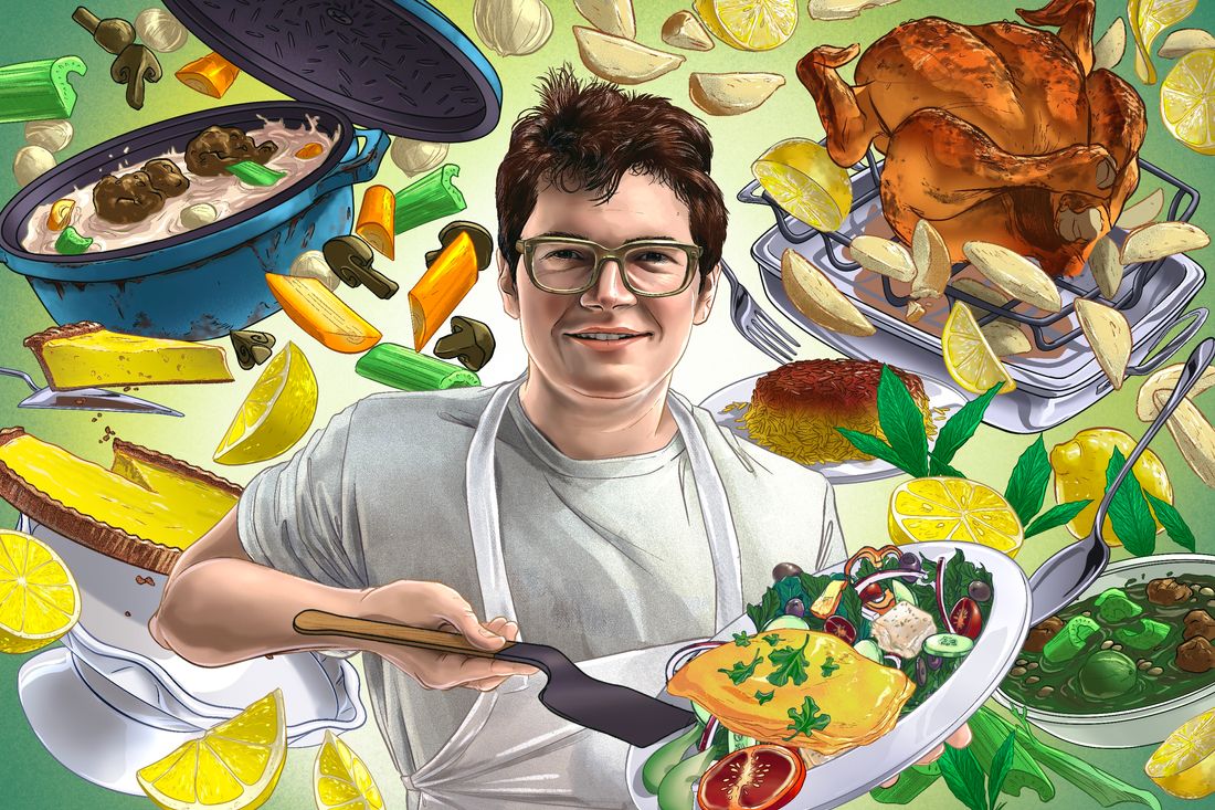 For dinner I made roast chicken, which I make almost every week. It’s my favorite food. I do it with garlic that you keep in its paper. In French, you call it ail en chemise, “garlic in the shirt.” I roast the chicken at a really low temperature for a long time, and at some point I add potatoes, which always take longer than the chicken. I get the oven really hot to finish the chicken because I like it to be very well done — not, like, hammered, but I like it when the chicken tastes like what you get outside a butcher shop in France. With the potatoes cooked in the chicken fat and a nice zippy salad: For me, that’s the best.