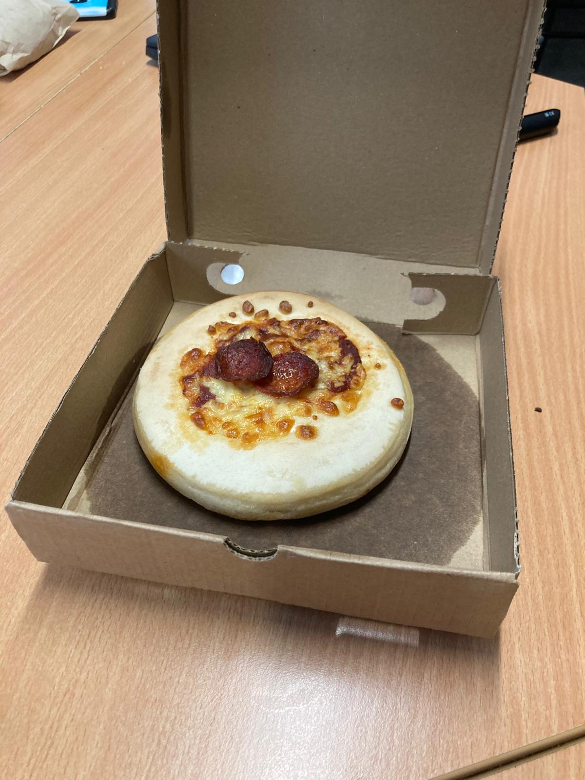 It looks like they used puff pastry for the base, but did a terrible job baking it. I can see the vision — it might have been a nice pizza-adjacent kind of croissant with some toppings on top. It’s clear that the product was too warm before they baked it, which cased the fat between the layers to melt and leak out. With the lacking toppings and awful distribution I think this should carry life in pizza prison, but possibility of parole with good baking practices.